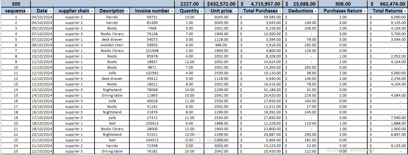 The project integrates dynamic formulas, automated calculations, and visual analytics through interactive charts. Each section (Purchases, Sales, and Expenses) was built to provide clear insights into company performance, helping management make accurate and data-driven decisions.