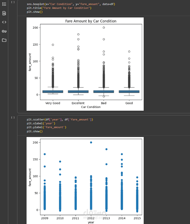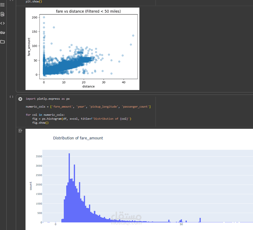 Scatter plots revealed a strong positive relationship: fares increase with distance.