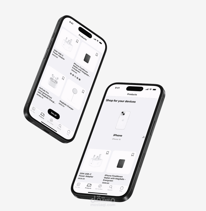 تصميم بسيط ومنظم باستخدام تبويبات (Tabs) للفئات الأساسية مثل الهواتف، الساعات، والإكسسوارات.