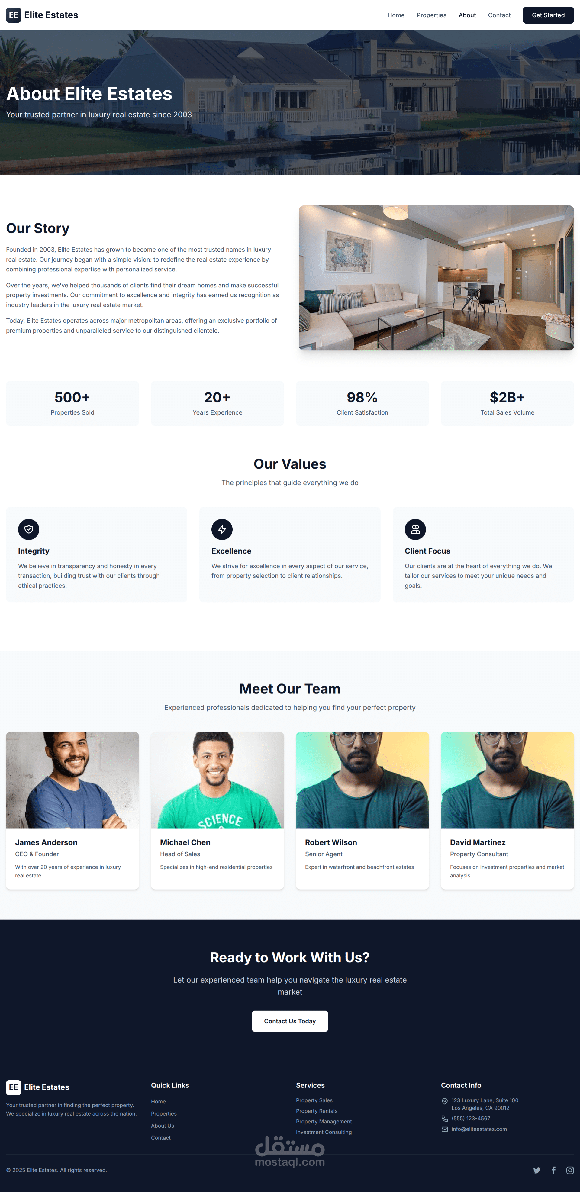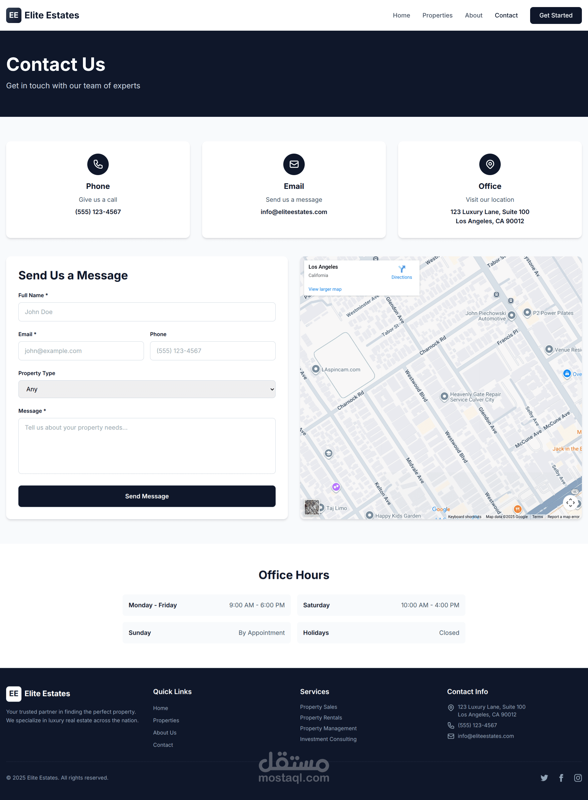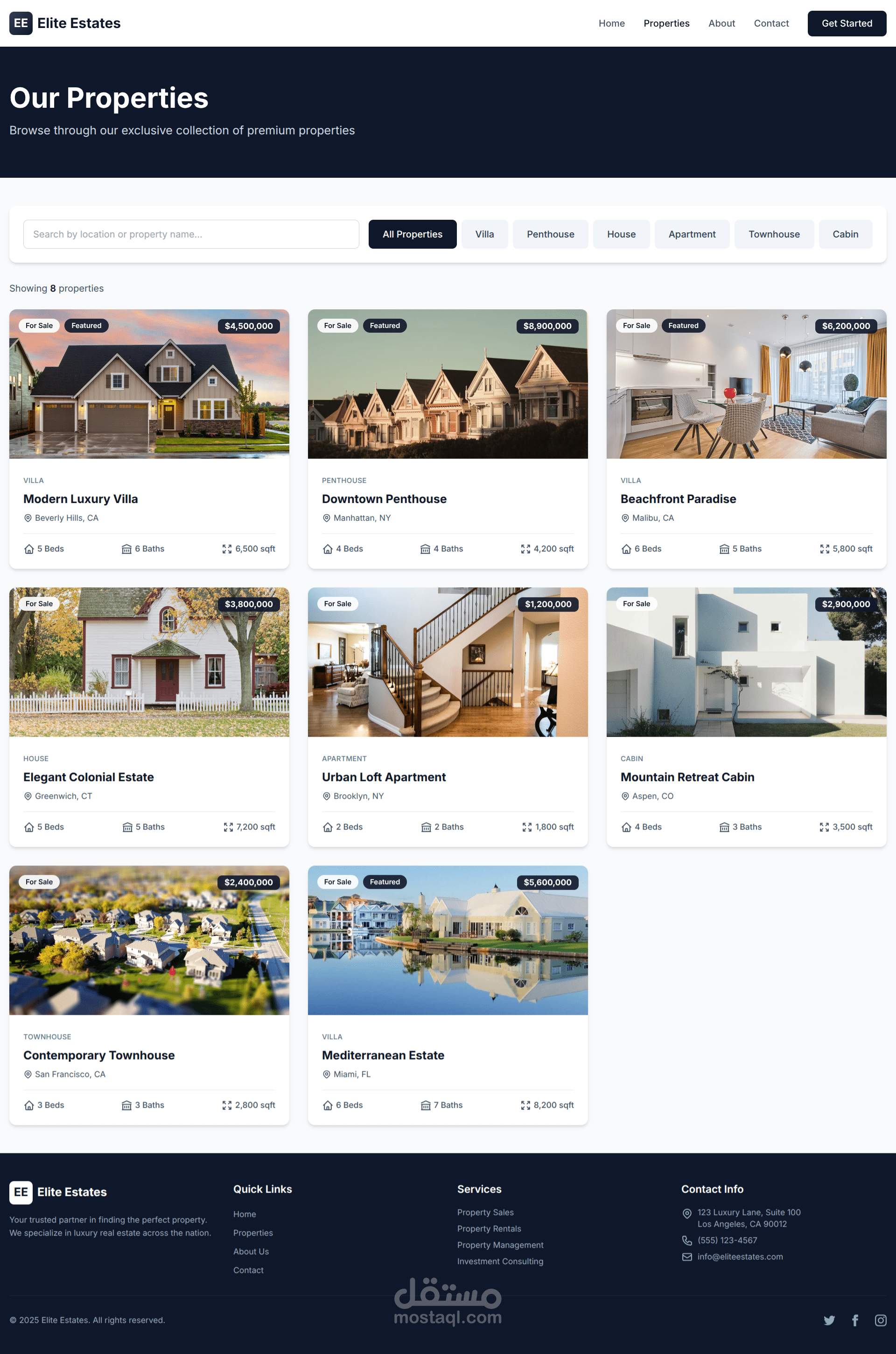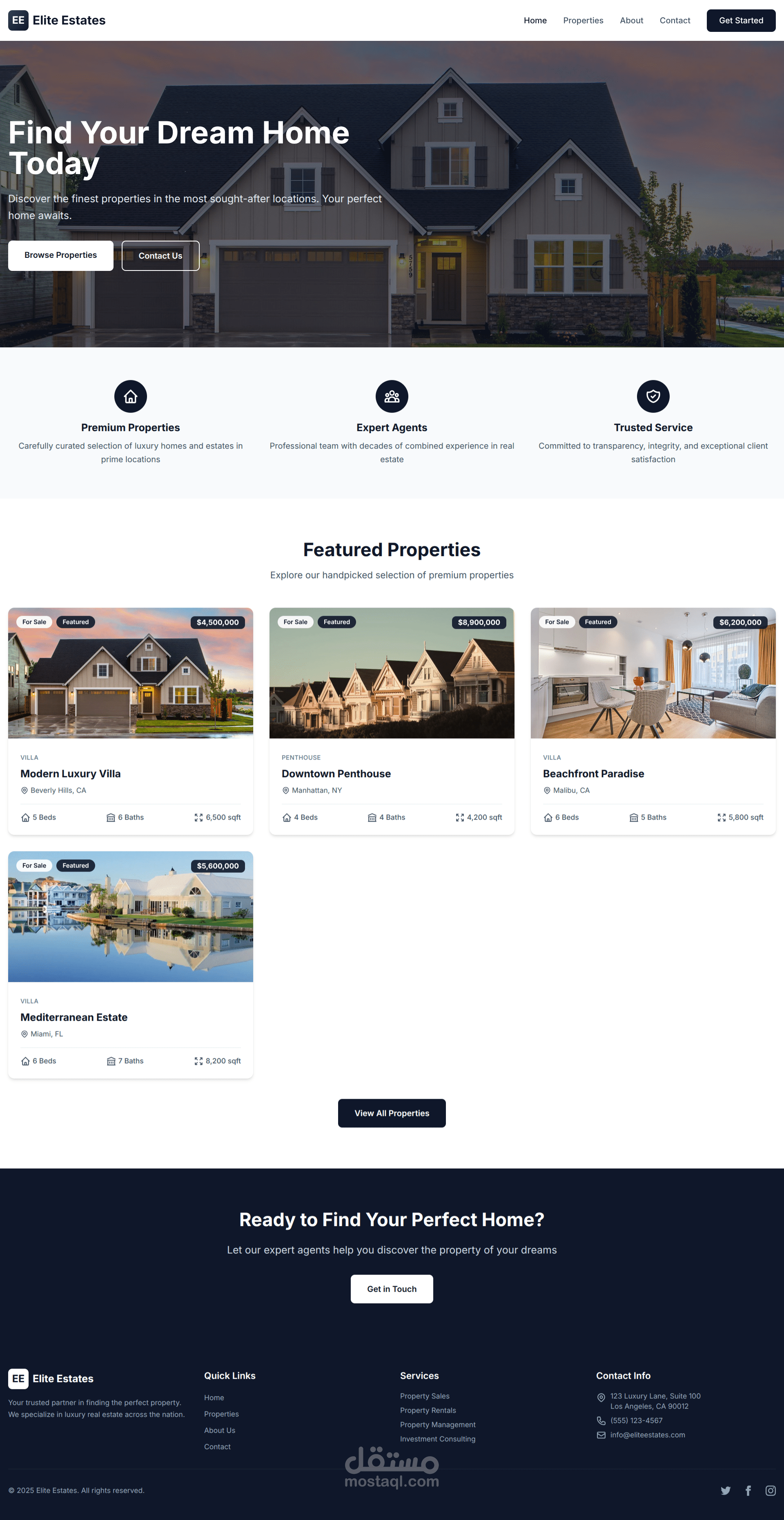 قمت بتطوير موقع عقاري تفاعلي باسم Elite Estates هو موقع عقاري فاخر مصمم ليجسّد الفخامة، الثقة، وسهولة تجربة المستخدم من خلال واجهة حديثة مبنية بتقنيات React وVite وTailwind CSS.الموقع عبارة عن تطبيق أحادي الصفحة (SPA) ويتميز بتصميم متجاوب وأداء عالي .