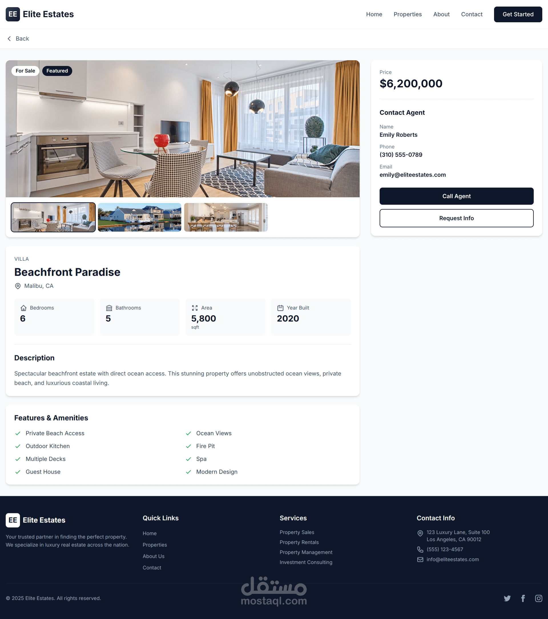 و يتيح الموقع عرض العقارات الفاخرة بطريقة أنيقة وسلسة، مع واجهات تفاعلية وتجربة تصفّح فريدة تعمل بانسيابية على جميع الأجهزة.