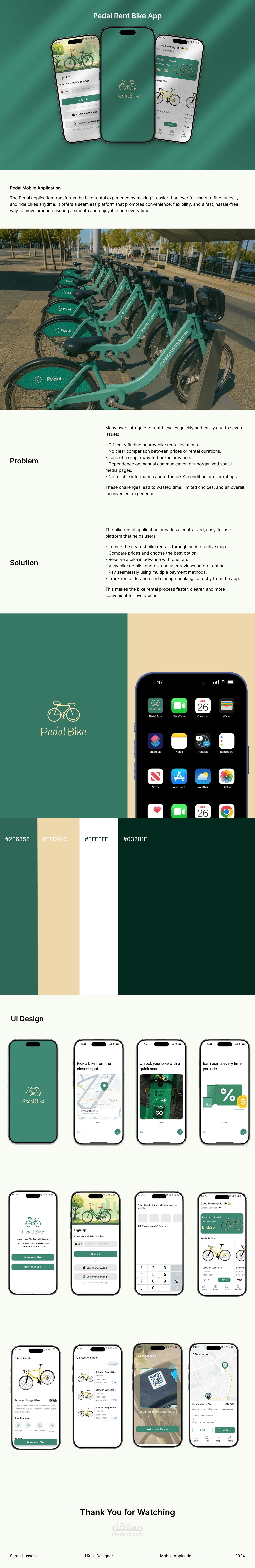 قمت بتصميم تطبيق Pedal، وهو تطبيق مخصص لتأجير الدراجات، يهدف إلى توفير وسيلة تنقّل سهلة وسريعة للمستخدمين في أي وقت ومن أي مكان. يركز التصميم على بساطة الاستخدام، مع تجربة سلسة ومريحة تسمح للمستخدم بتحديد أقرب دراجة، مسح الـ QR، والانطلاق مباشرة.