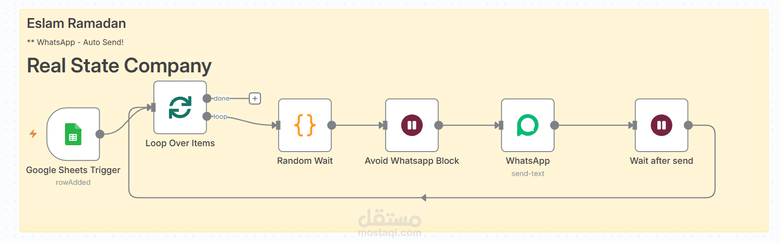 عند إضافة صف جديد في Google Sheets يحتوي على رقم الهاتف ونص الرسالة، يتم تشغيل الورك فلو تلقائيًا فيقوم النظام بارسال الرسائل عبر WhatsApp.