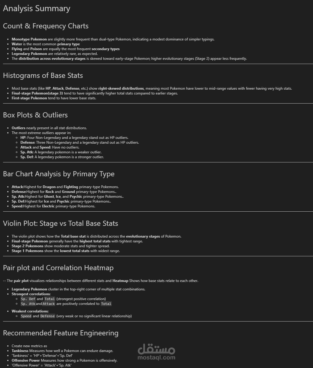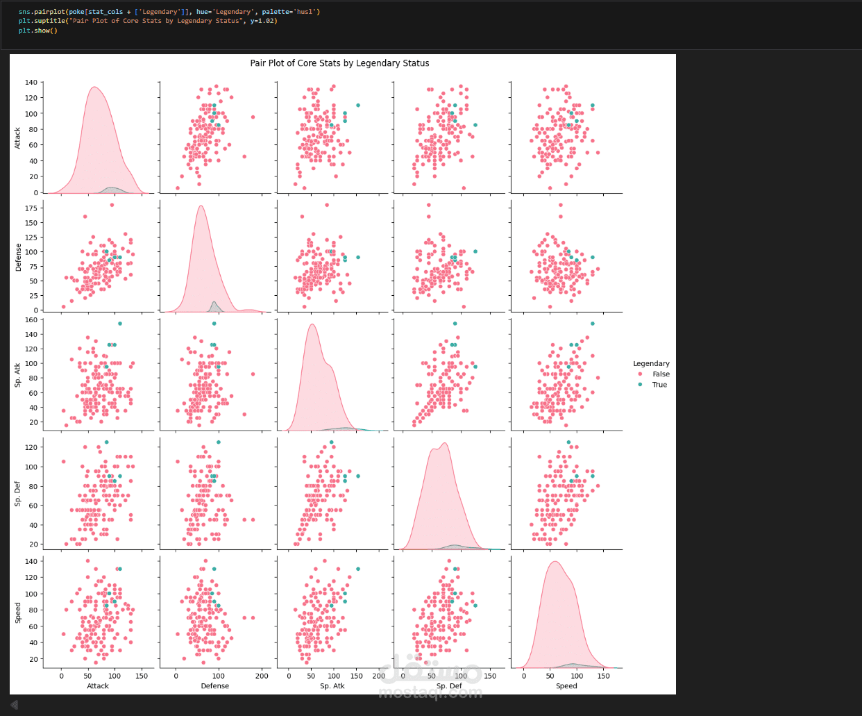 إجراء تحليل بياني شامل (EDA) لاكتشاف العلاقات بين الخصائص مثل النوع (Type) وقوة الهجوم (Attack) والسرعة (Speed).