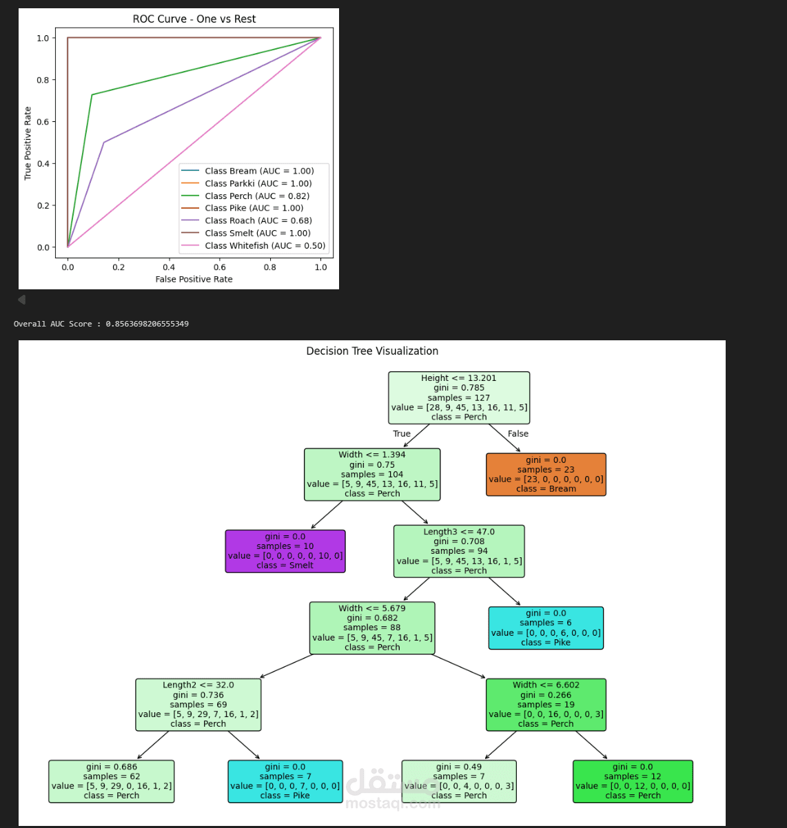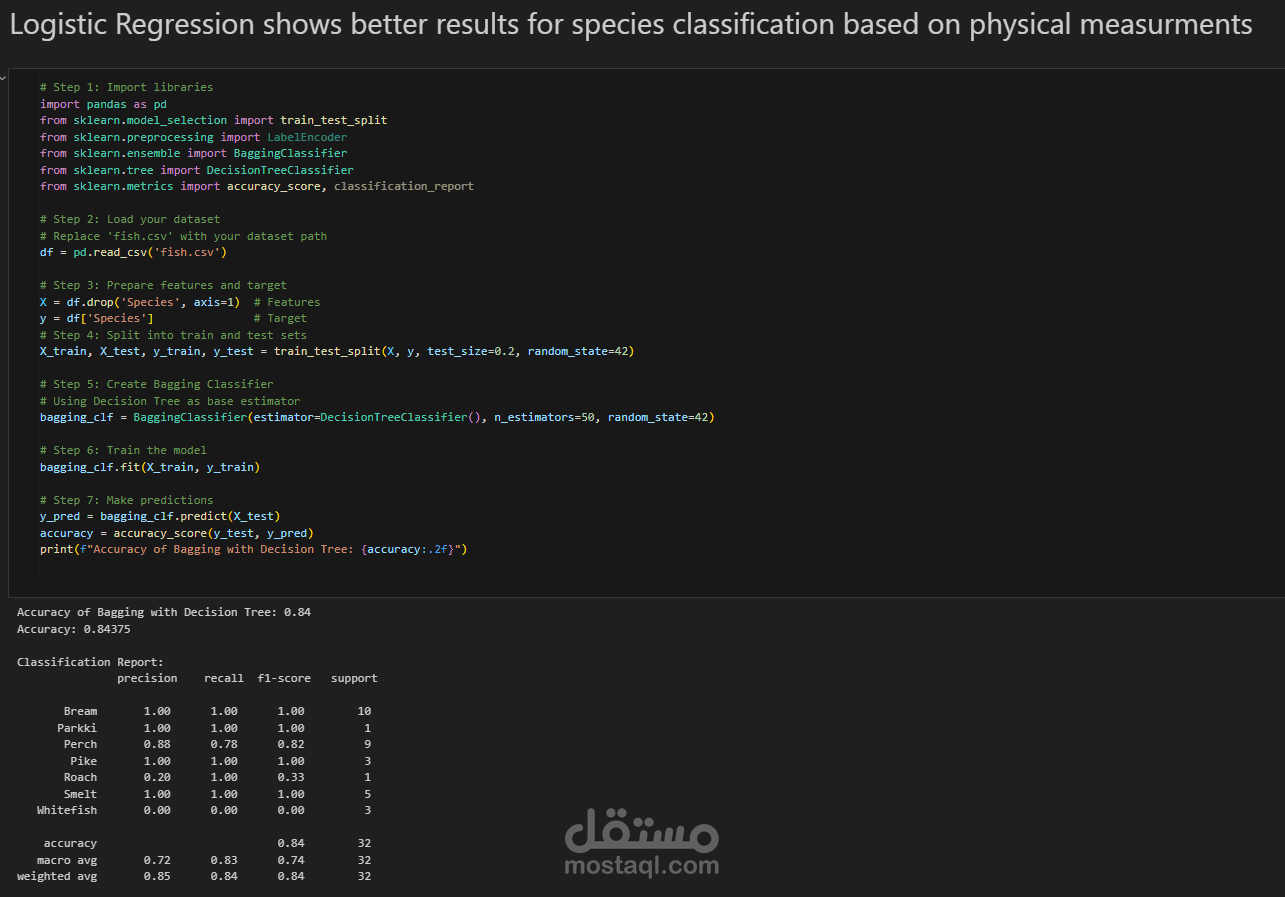 تطبيق نماذج Logistic Regression, Decision Tree, وK-Nearest Neighbors (KNN) لتحديد نوع السمكة من خلال قياساتها الفيزيائية.