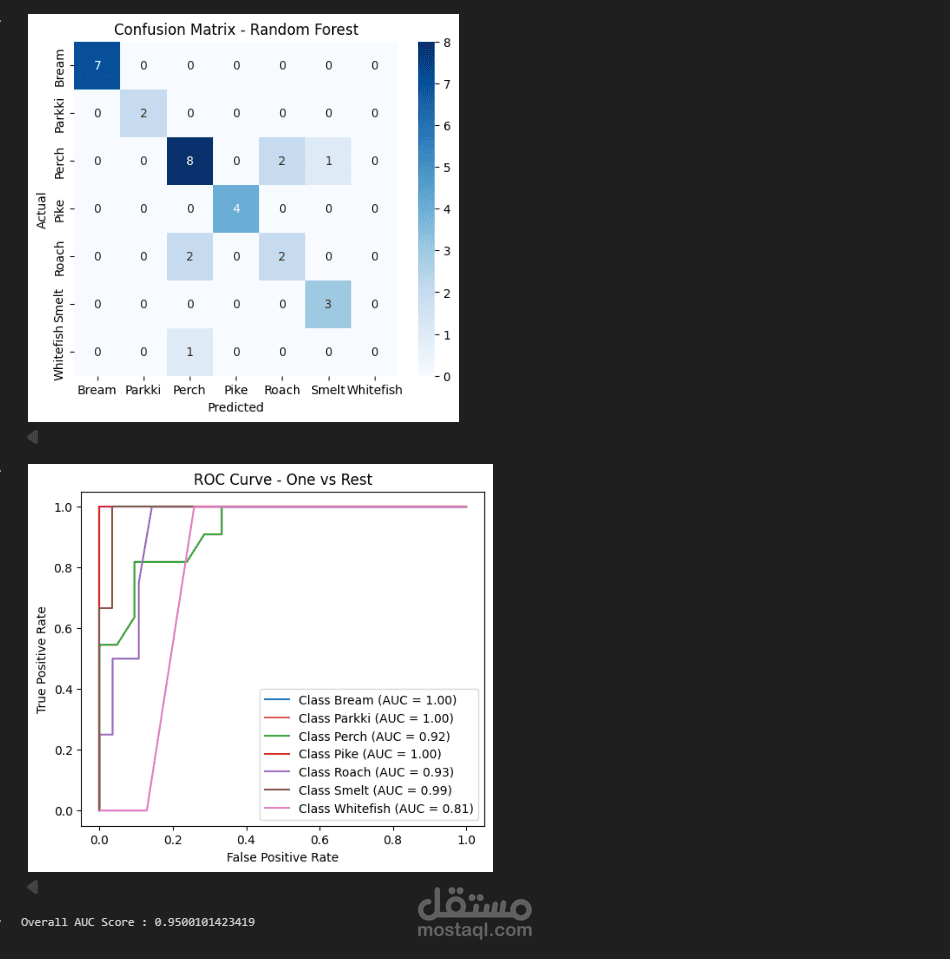 تدريب نماذج Linear Regression وRandom Forest Regressor وSupport Vector Regressor (SVR) للتنبؤ بوزن السمكة اعتمادًا على أبعادها.