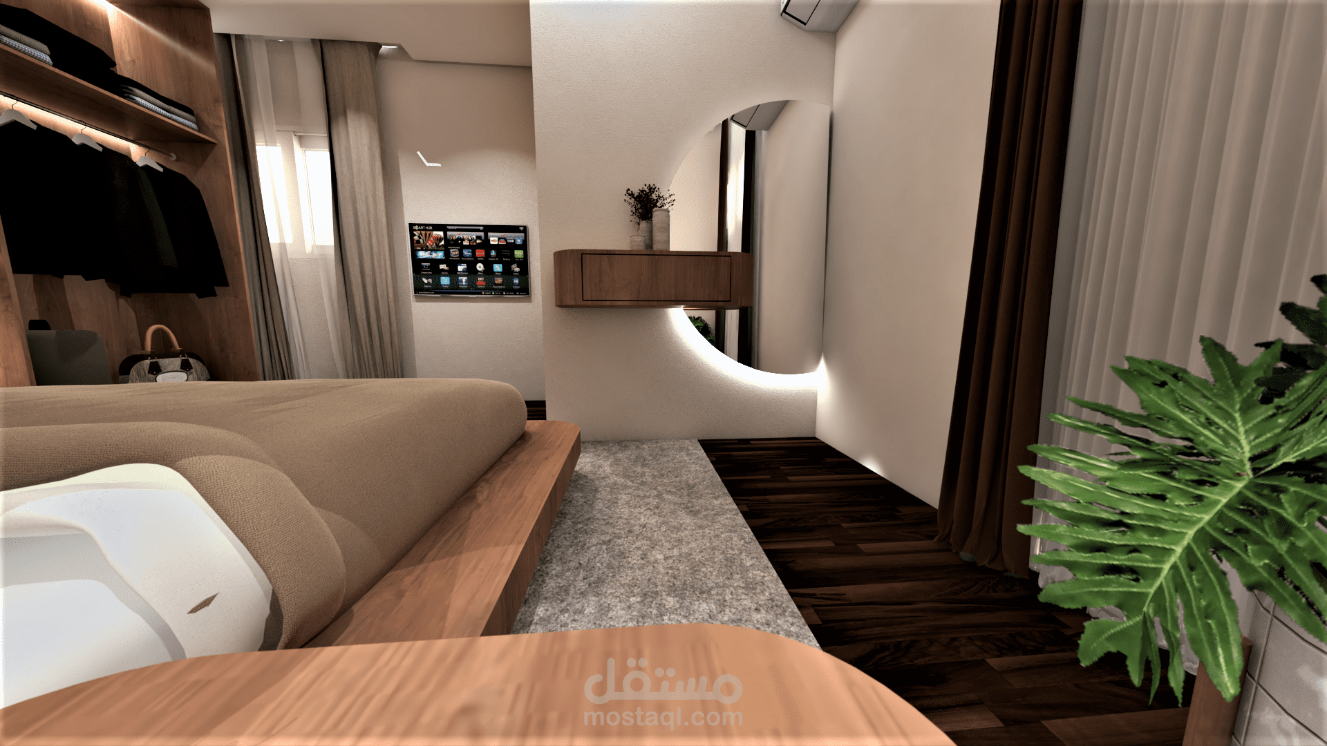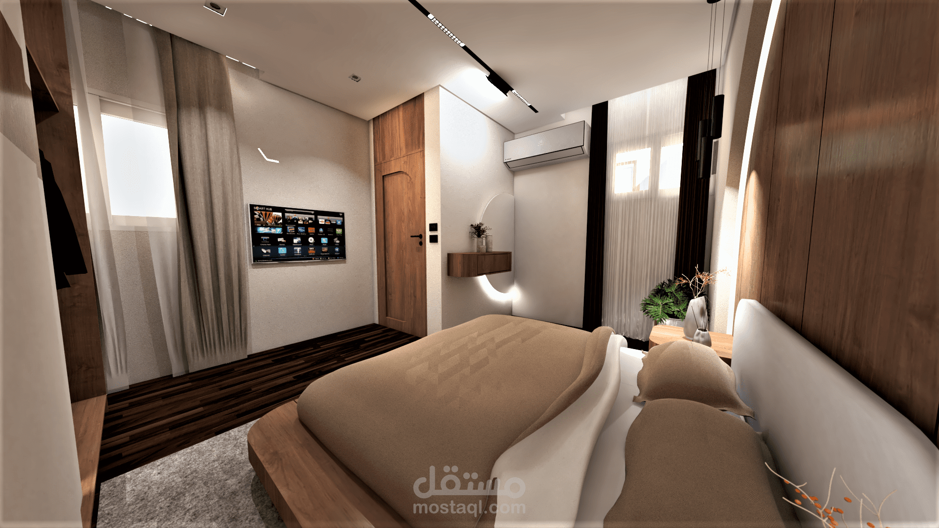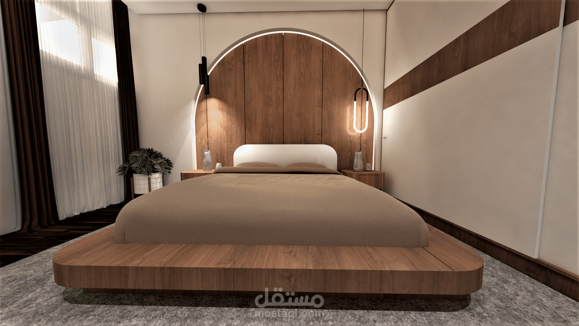 This project showcases a modern minimalist bedroom designed to evoke calm and comfort. I combined neutral tones with unique wall cladding, clean geometric lines, and soft indirect lighting. Every detail was carefully balanced using high-quality materials to create a sophisticated, relaxing space.