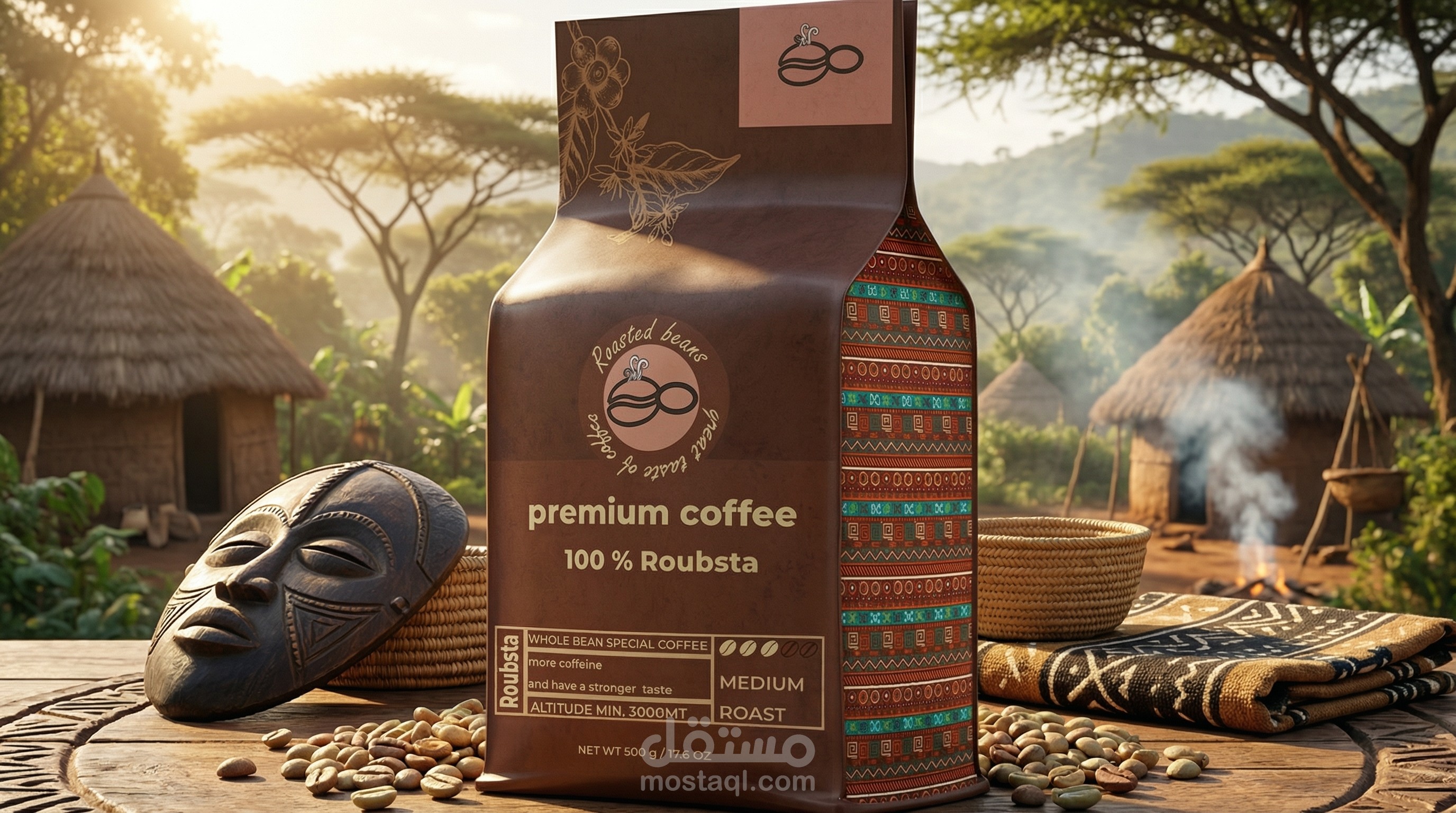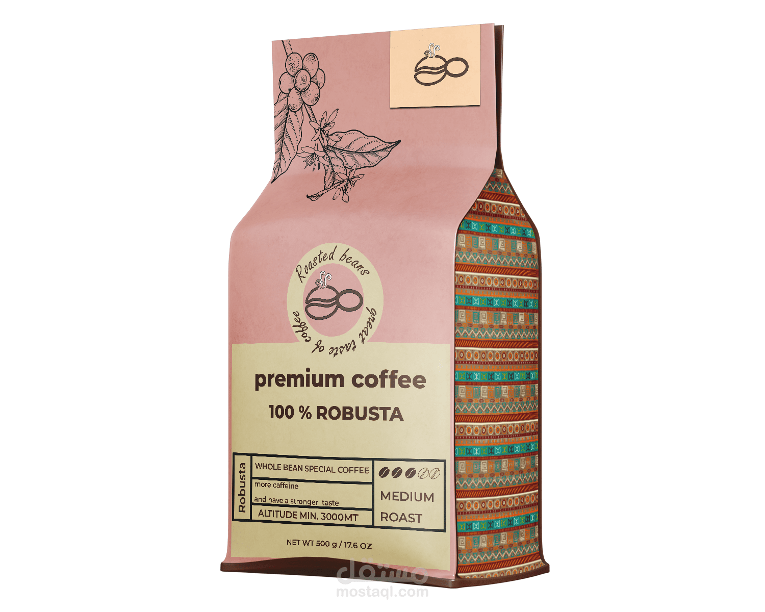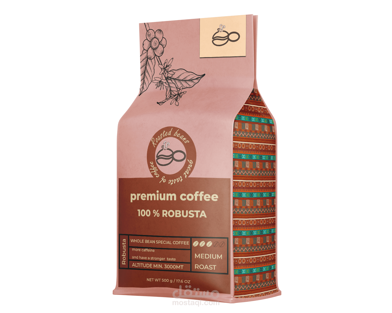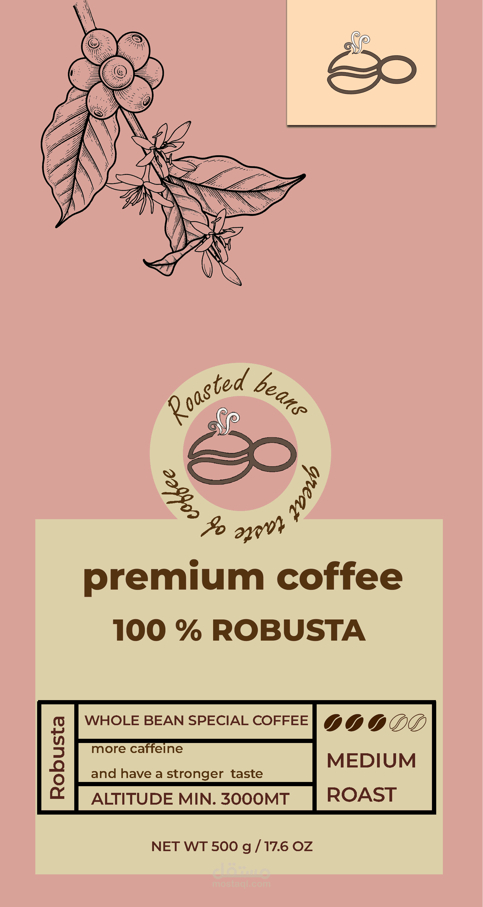 Labeling and Typography: Clear typography and icons are used to highlight essential details such as the coffee type (100% Robusta/Arabica), roast level (Medium Roast), and altitude, ensuring transparency for the consumer.