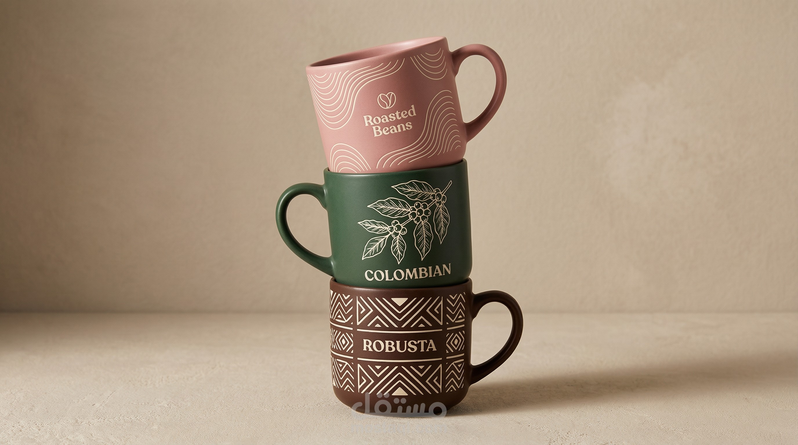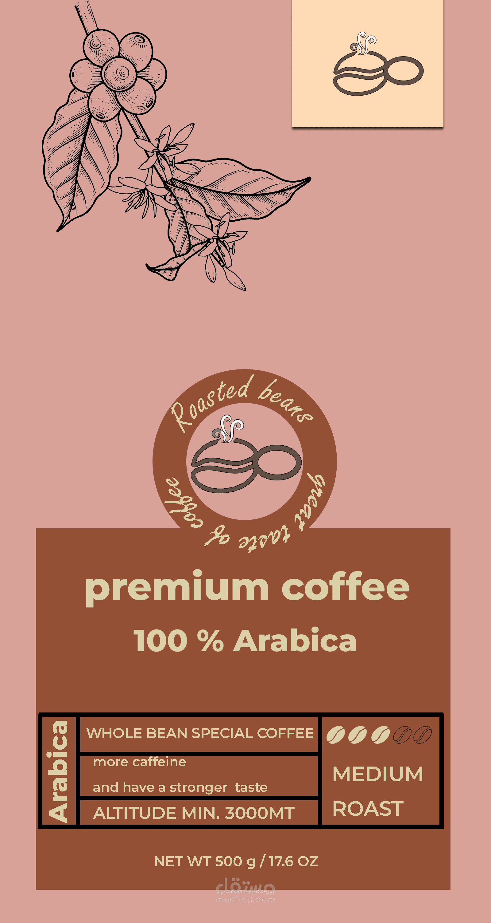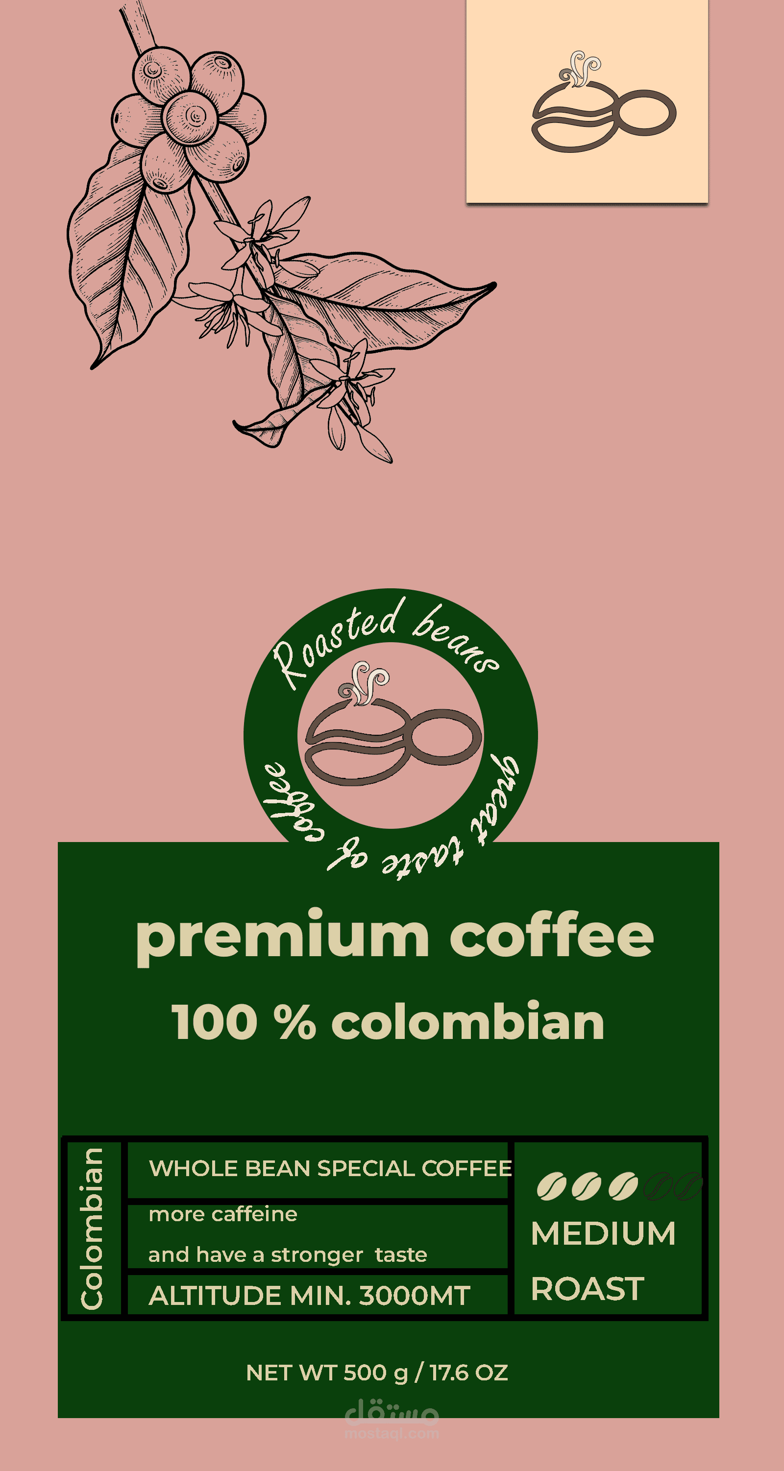 Color Palette: A warm and sophisticated mix of soft pink/tan, deep forest green, and rich brown, echoing the natural colors of the coffee plant and soil.