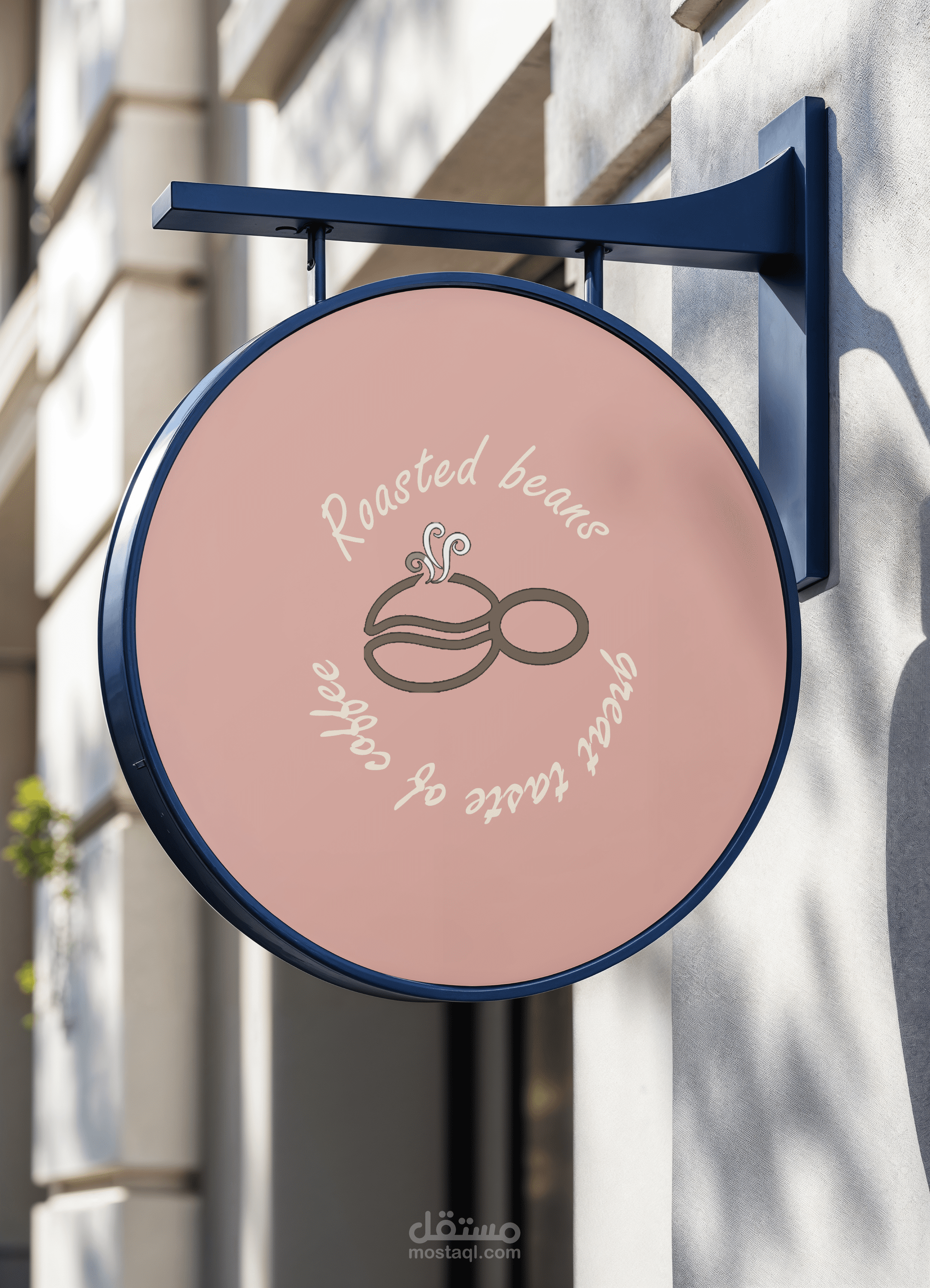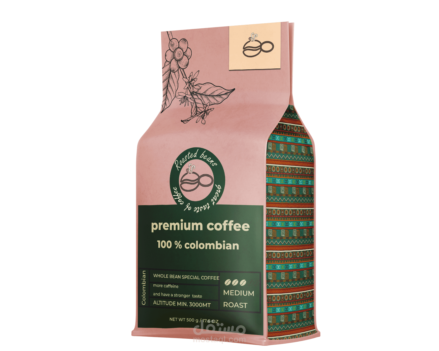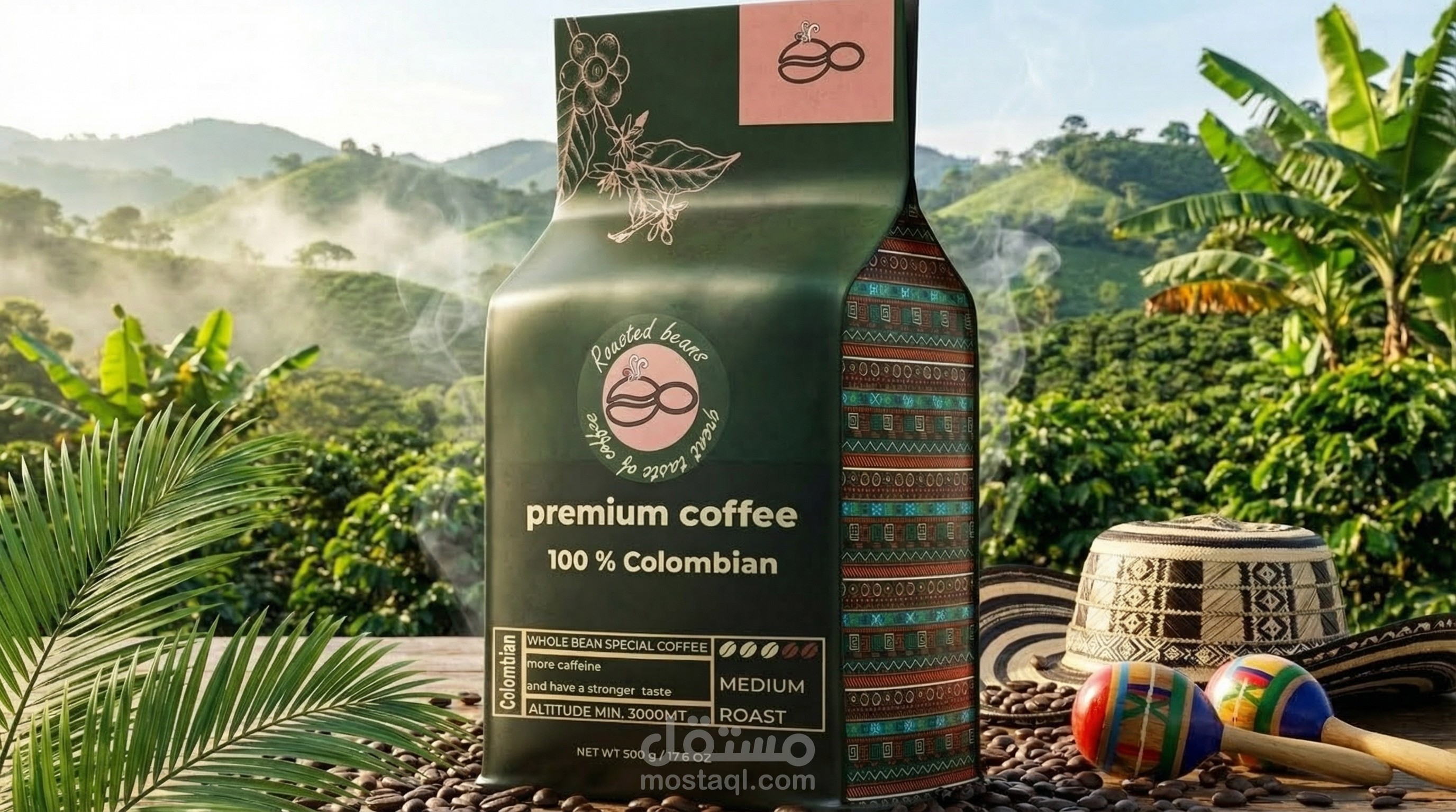 Color Palette: A warm and sophisticated mix of soft pink/tan, deep forest green, and rich brown, echoing the natural colors of the coffee plant and soil.