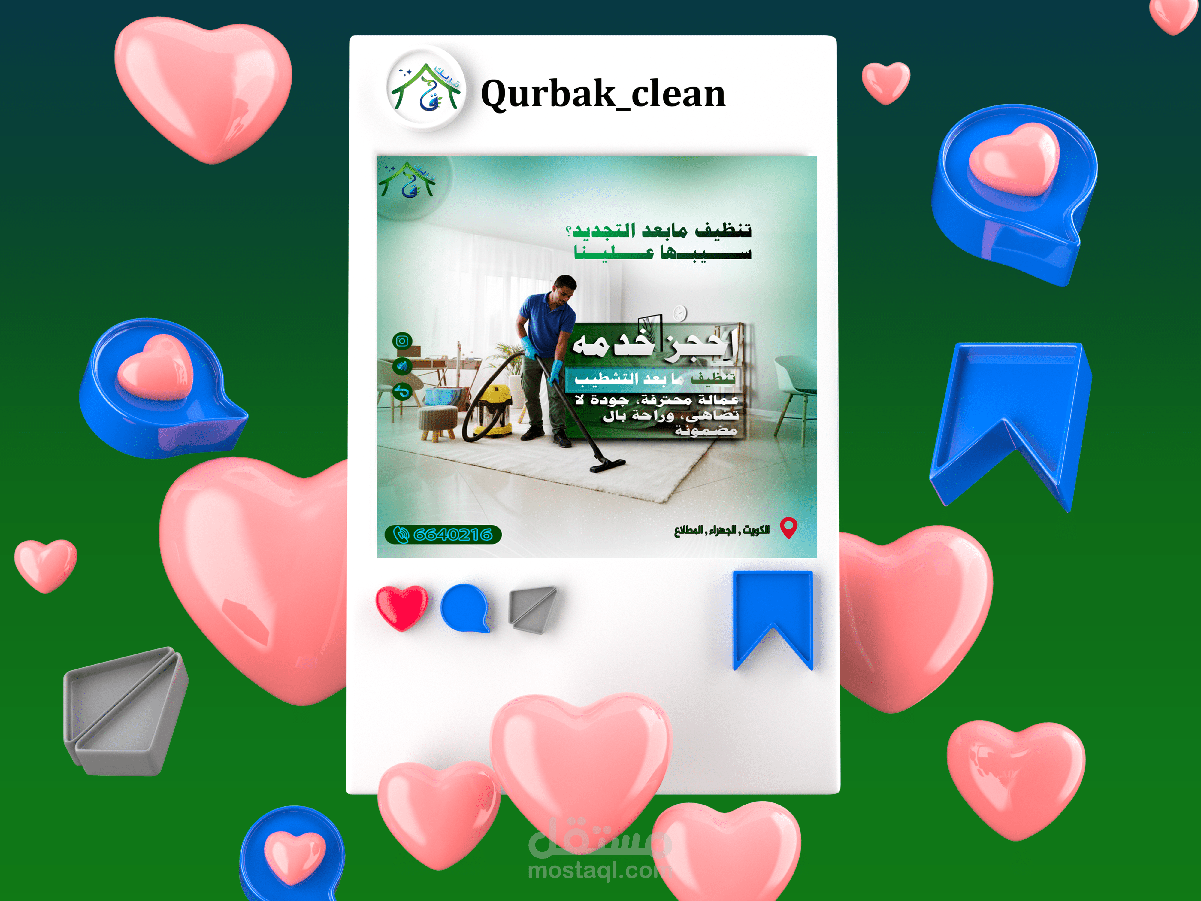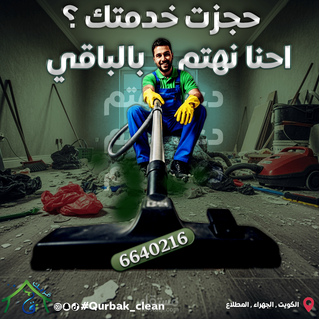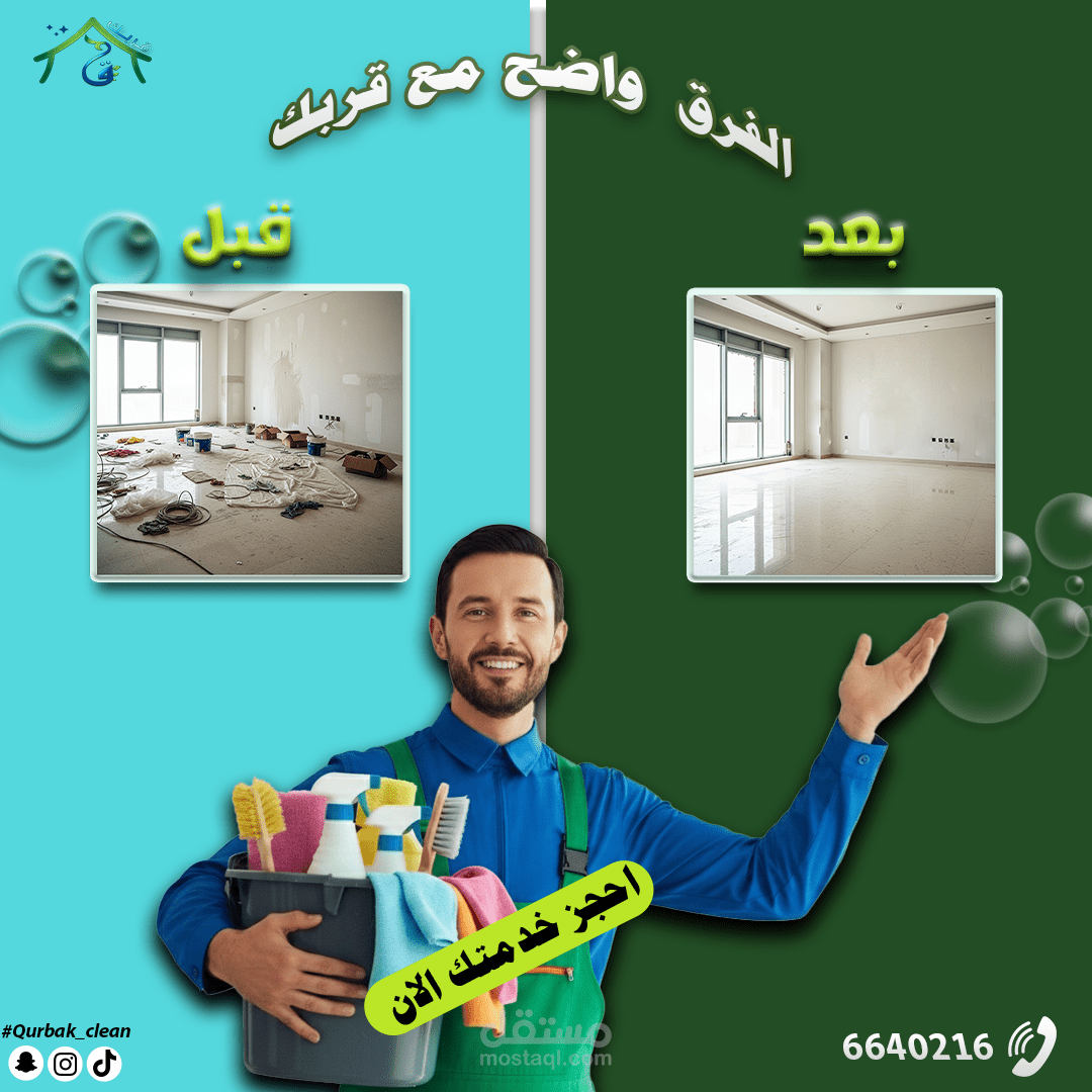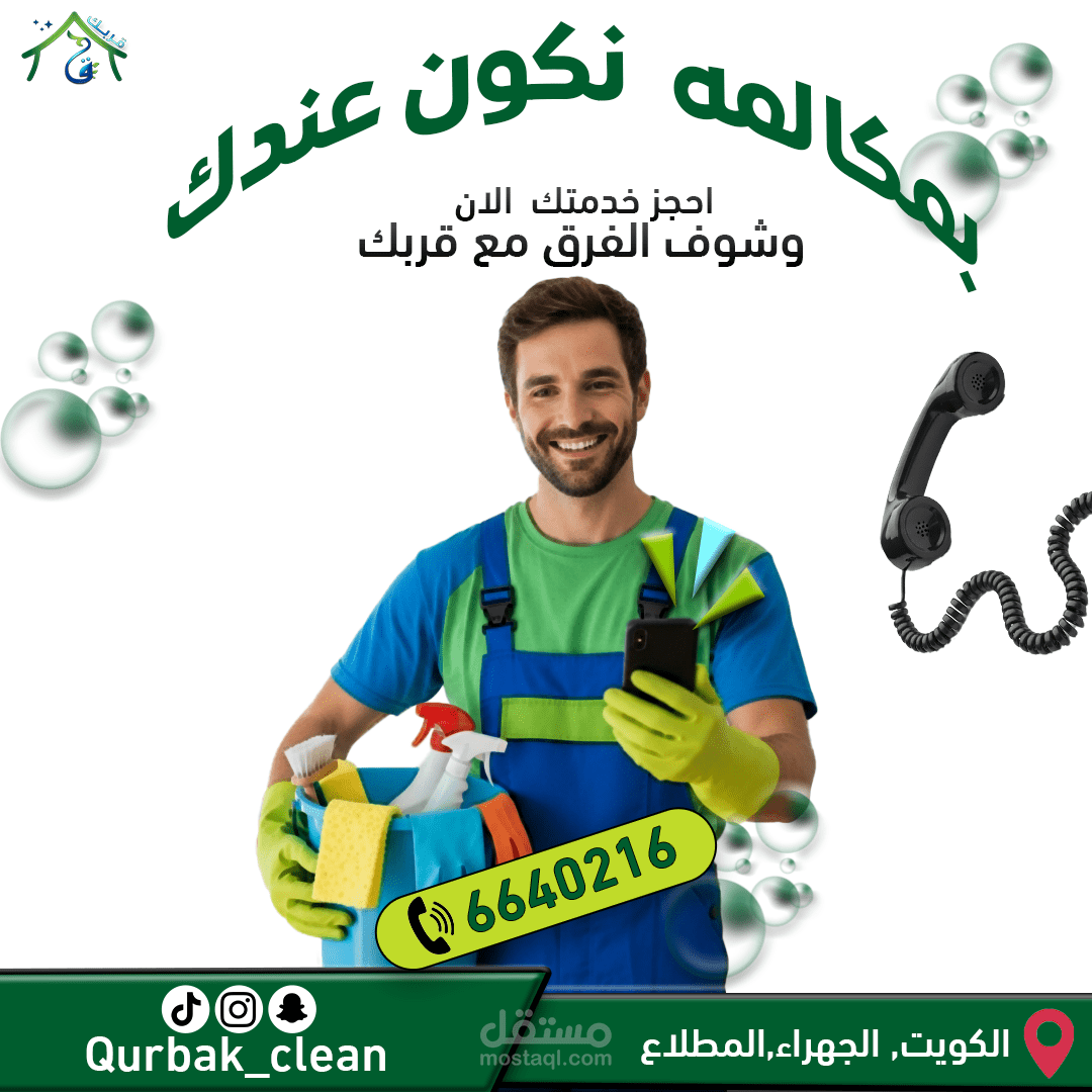 This project involved the creation of a comprehensive suite of social media graphics and content templates for "Qurbak" (meaning "Near You" or "Your Proximity"), a professional cleaning services company based in Al-Mutlaa, Kuwait. The objective was to establish a strong online presence, build brand recognition, and effectively communicate Qurbak's commitment to quality, reliability, and local accessibility within its target market.