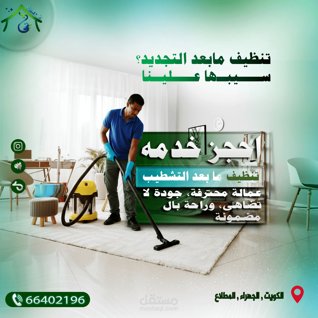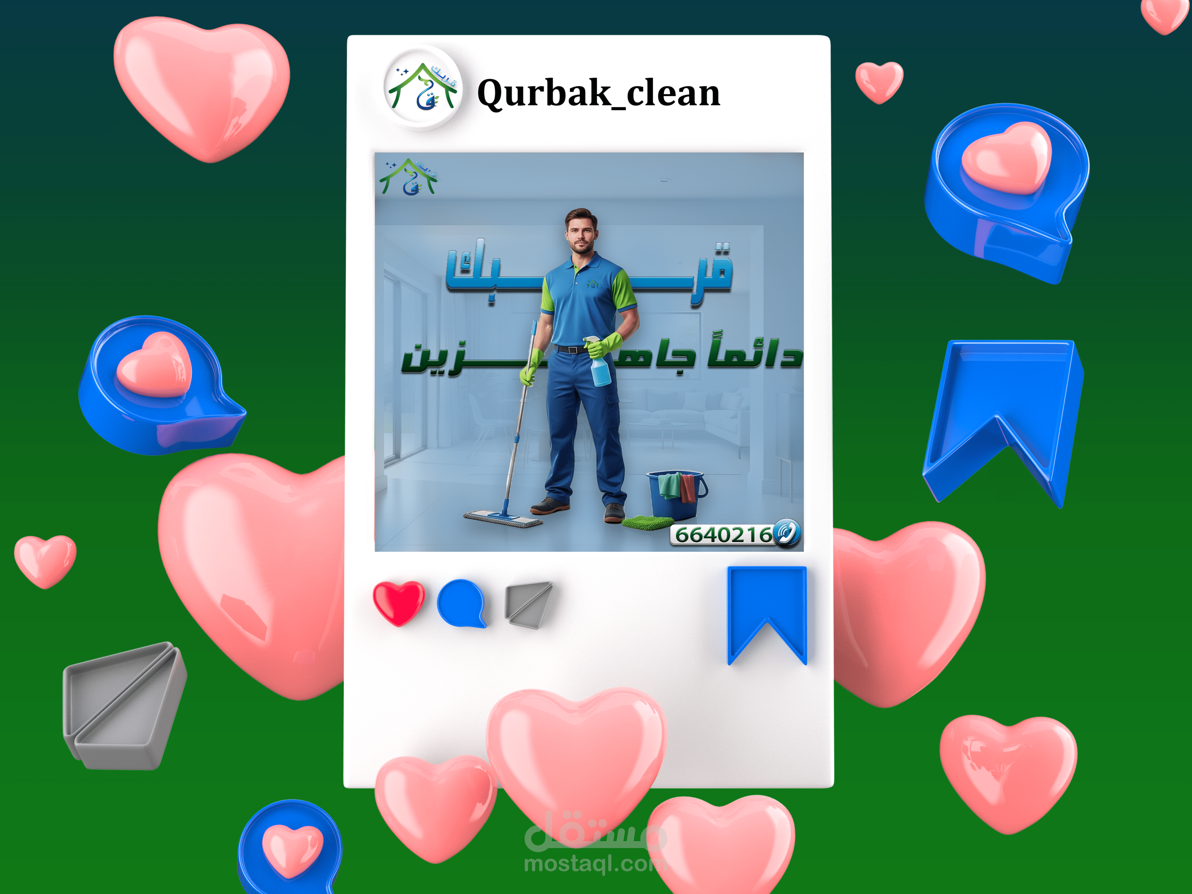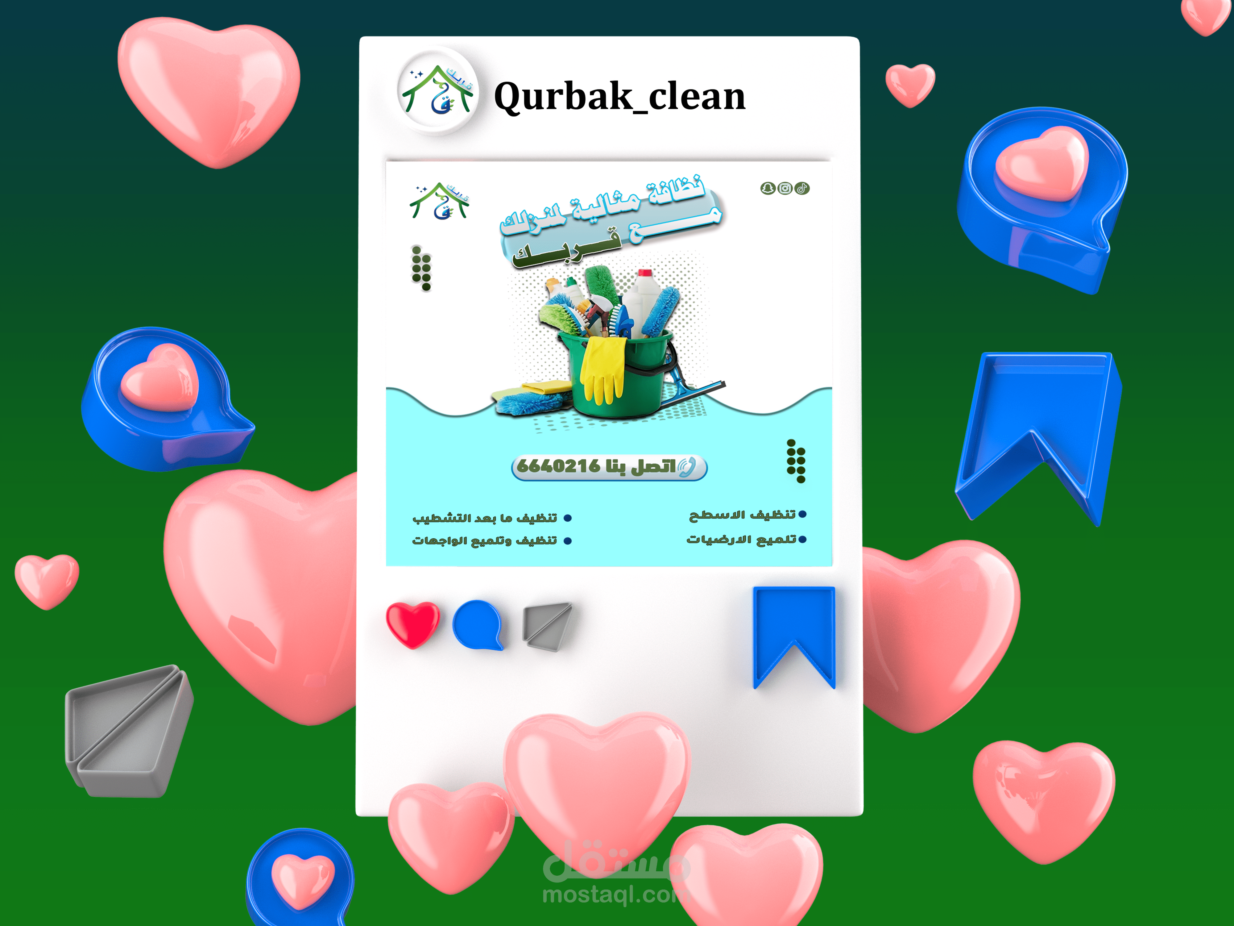 This project involved the creation of a comprehensive suite of social media graphics and content templates for "Qurbak" (meaning "Near You" or "Your Proximity"), a professional cleaning services company based in Al-Mutlaa, Kuwait. The objective was to establish a strong online presence, build brand recognition, and effectively communicate Qurbak's commitment to quality, reliability, and local accessibility within its target market.