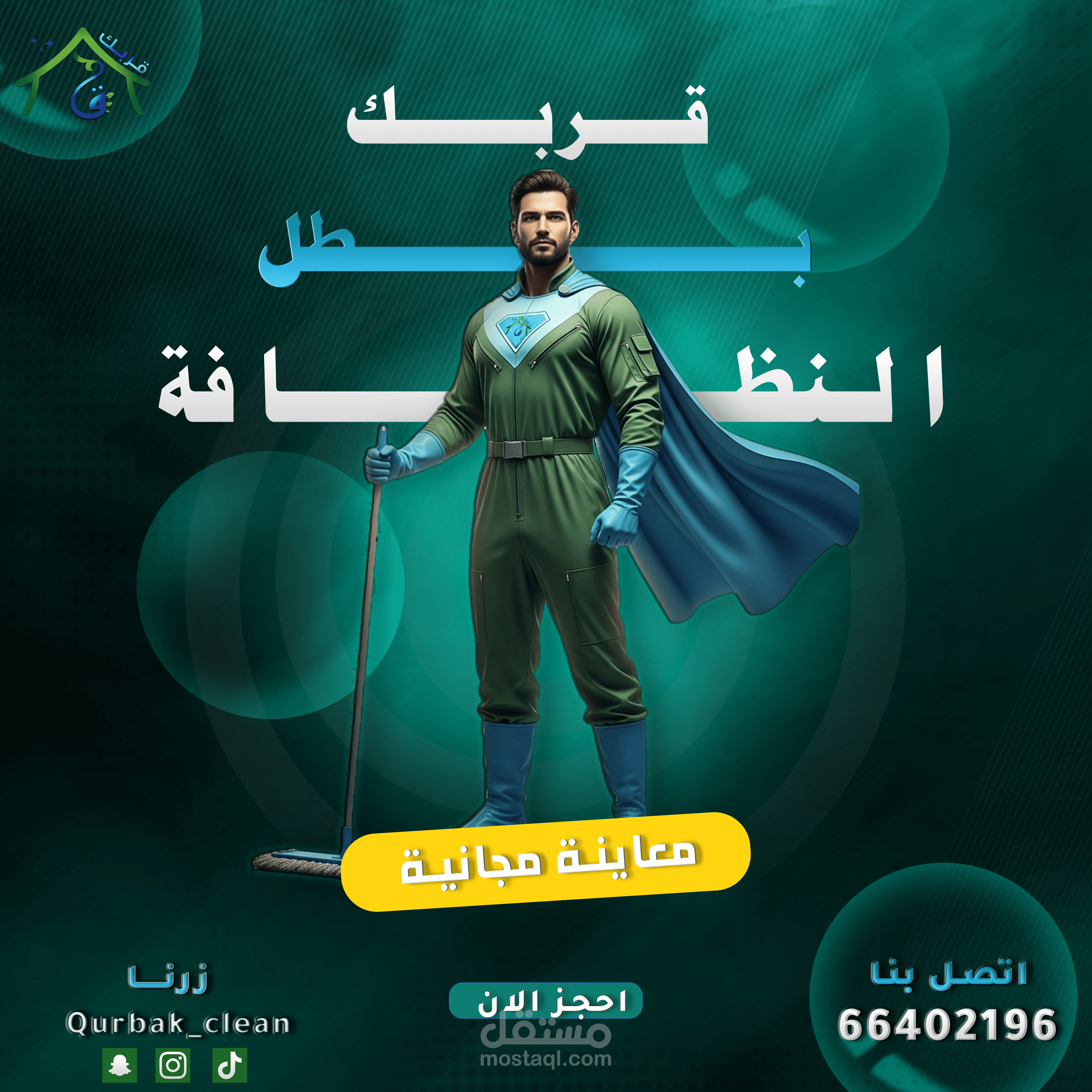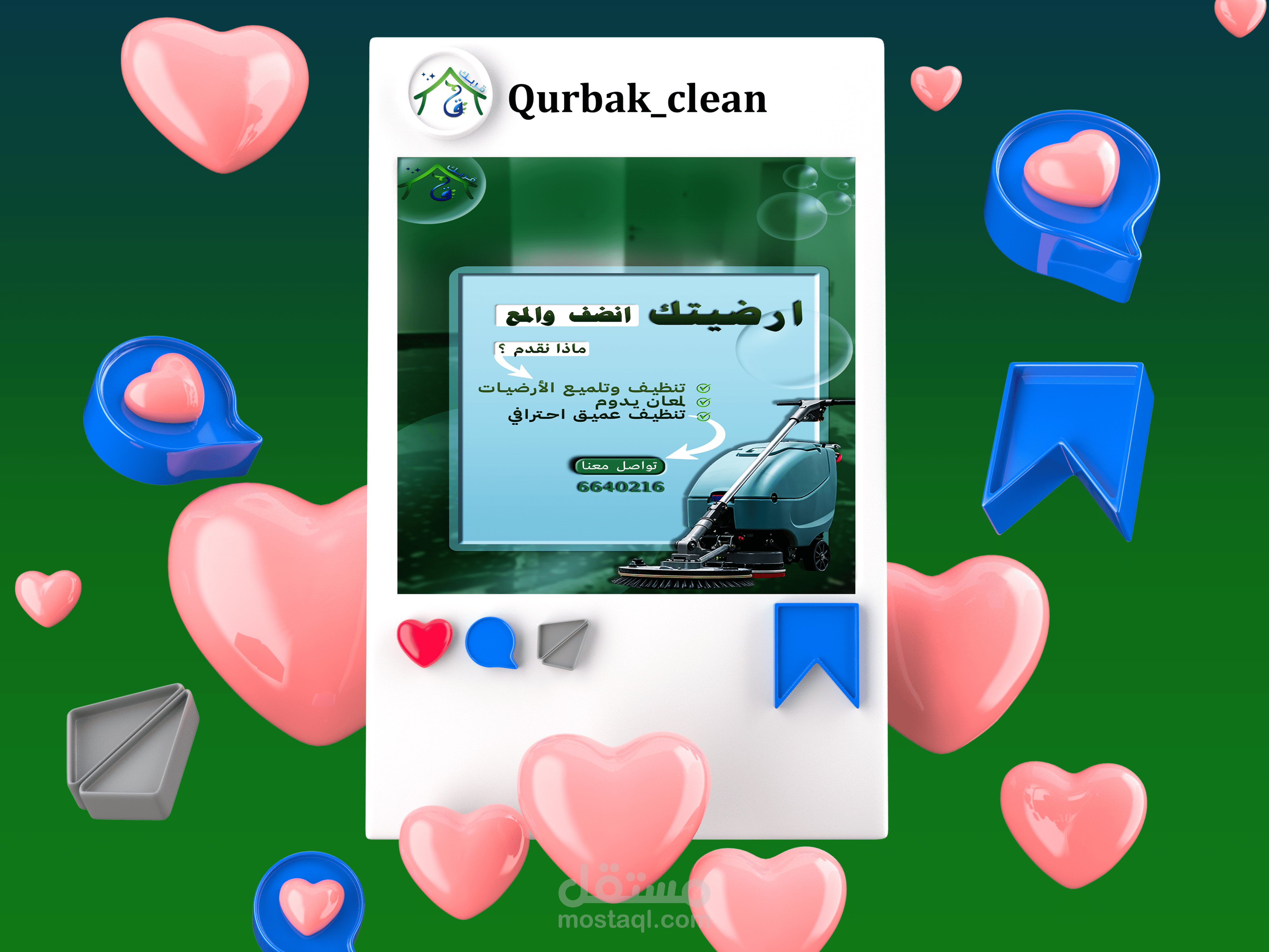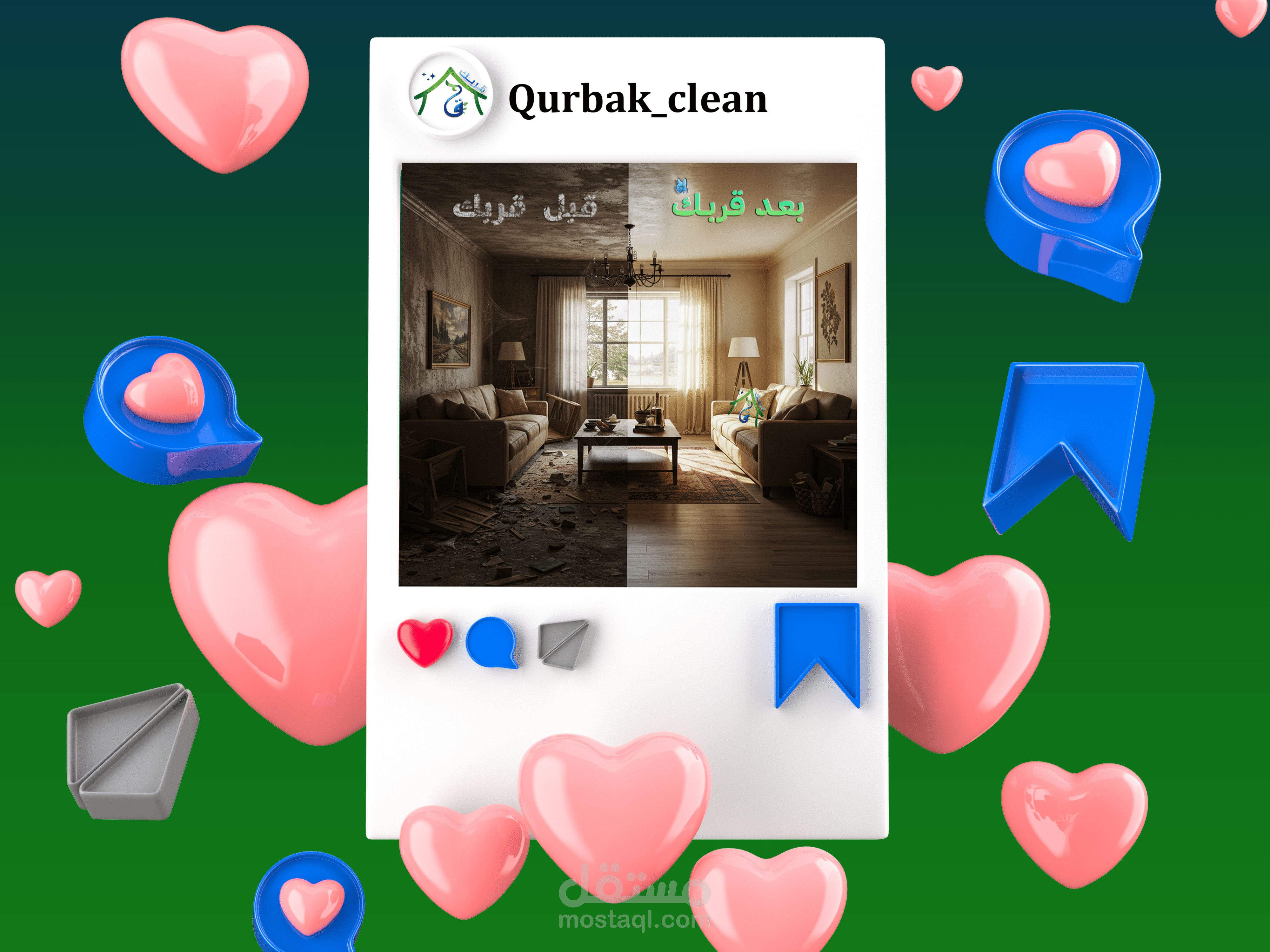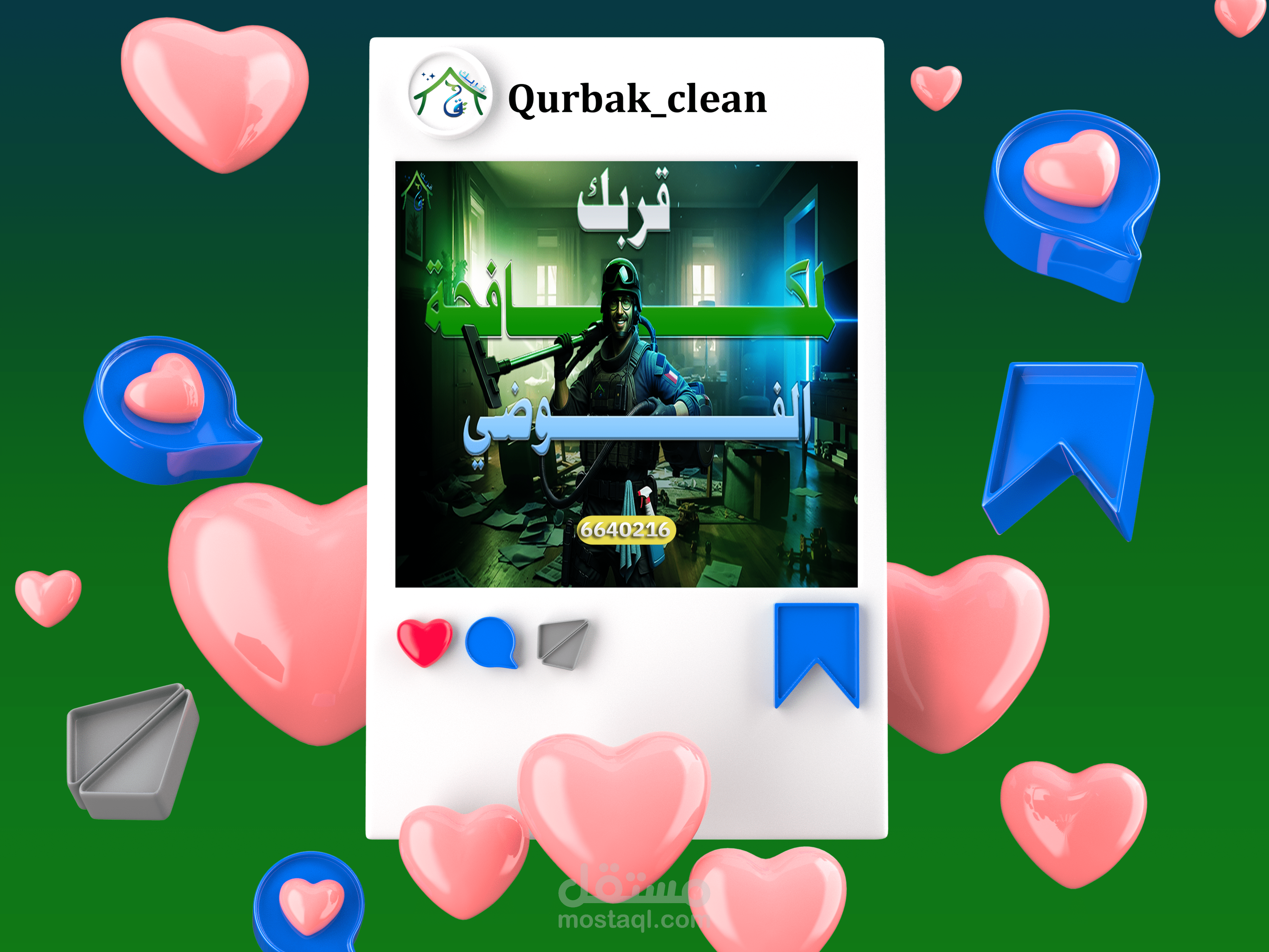 This project involved the creation of a comprehensive suite of social media graphics and content templates for "Qurbak" (meaning "Near You" or "Your Proximity"), a professional cleaning services company based in Al-Mutlaa, Kuwait. The objective was to establish a strong online presence, build brand recognition, and effectively communicate Qurbak's commitment to quality, reliability, and local accessibility within its target market.