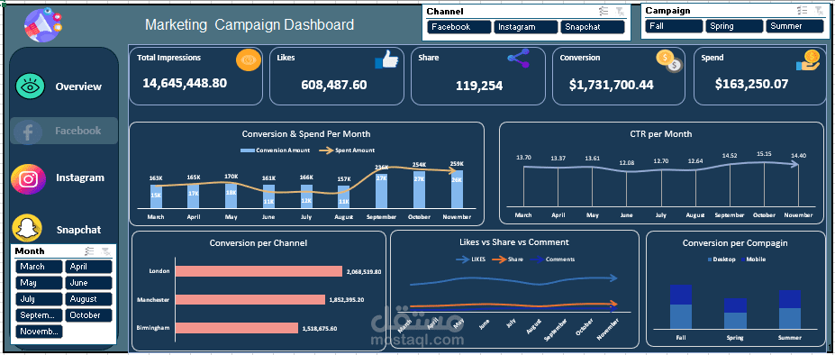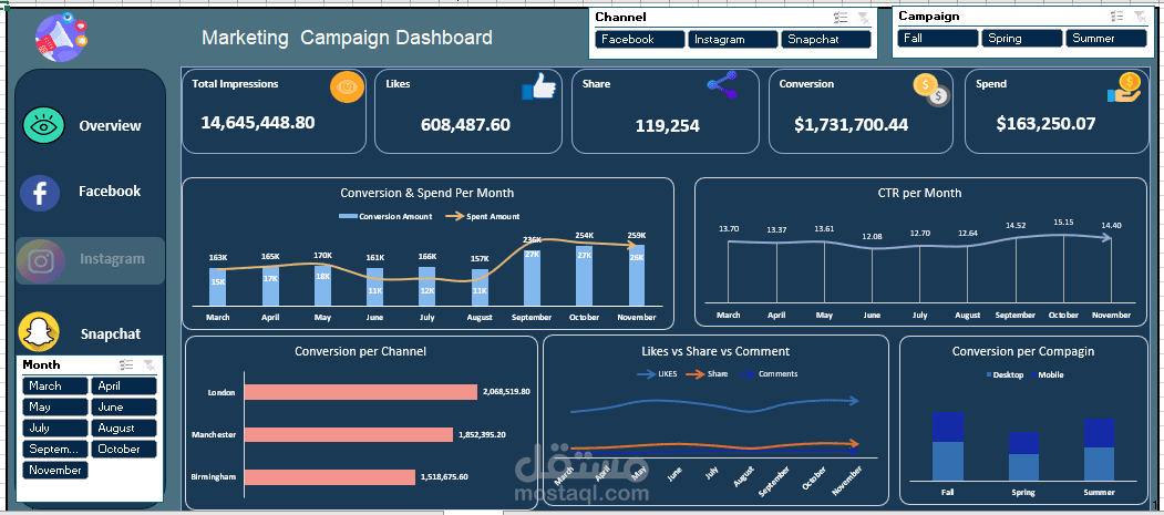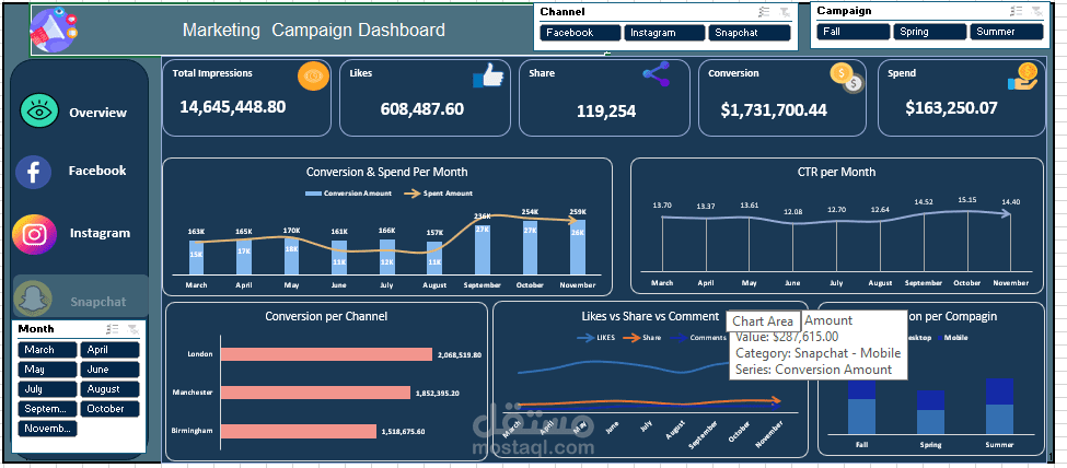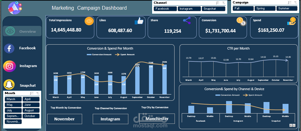 Thrilled to share our Marketing Campaign Dashboard, Facebook, Instagram, and Snapchat.