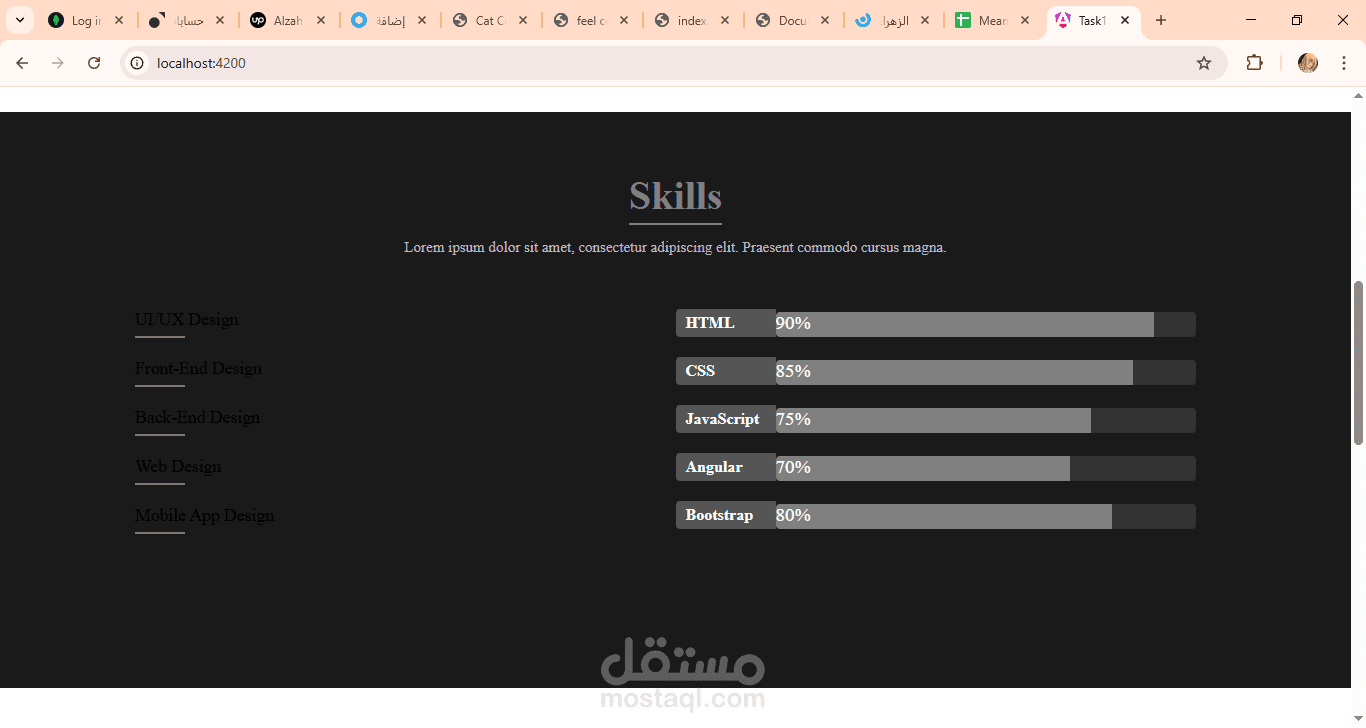 تنفيذ قسم "المهارات" الديناميكي (Skills) باستخدام أشرطة تقدم (Progress Bars) لتحديد مستوى الإتقان في التقنيات الأساسية (HTML, CSS, JavaScript, Angular, Bootstrap).