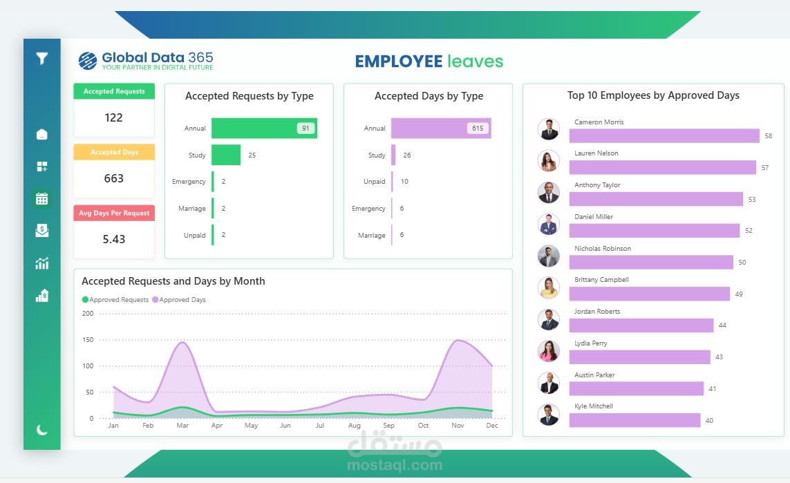 Highlights each employee’s total working hours, active projects, and average daily performance.