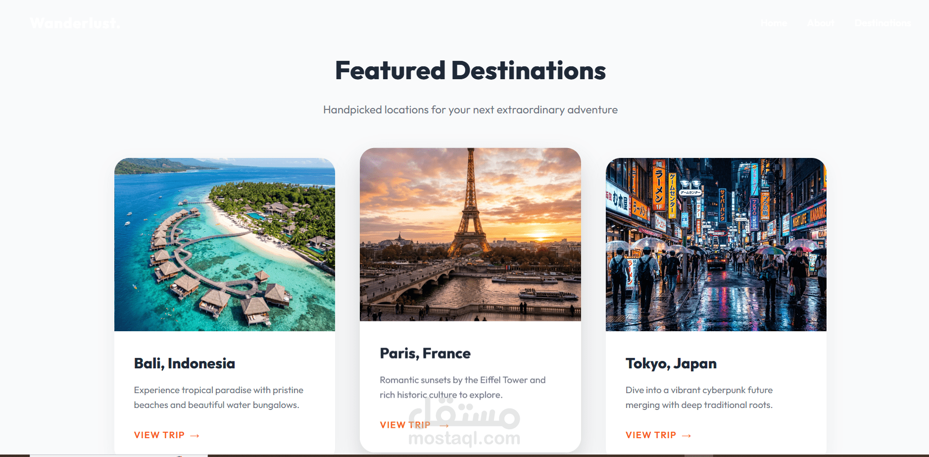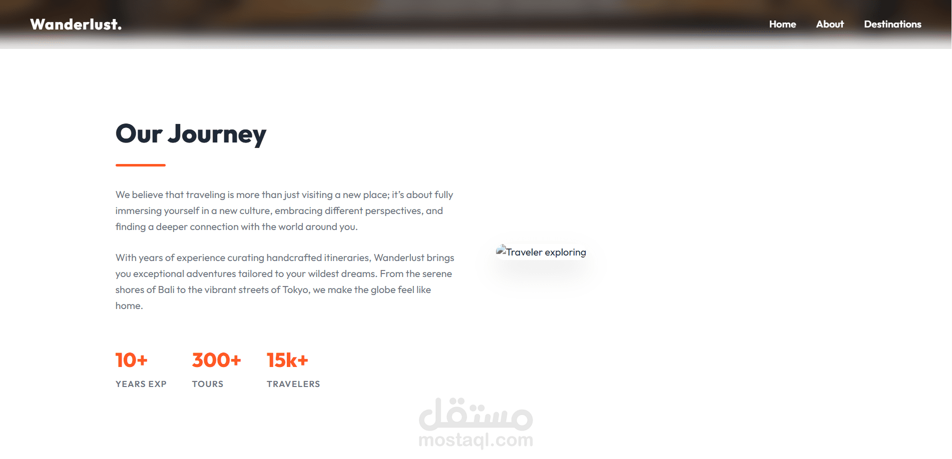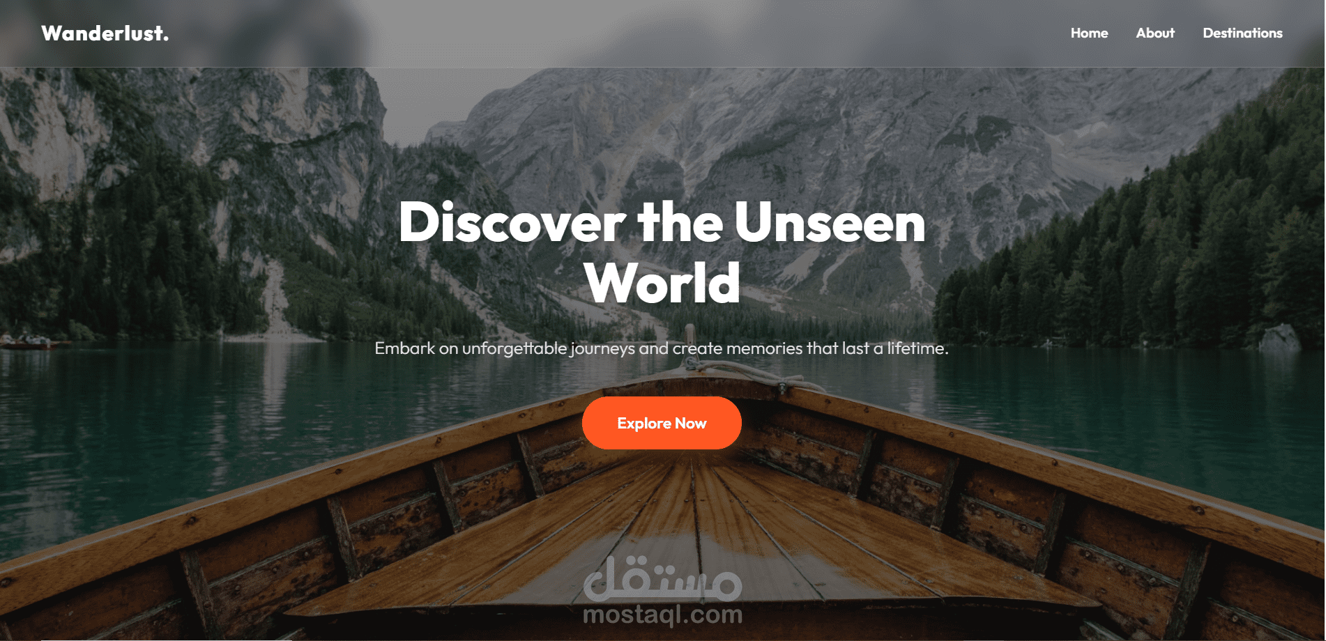 أقدّم لك تصميم وتطوير موقع سياحي احترافي (Landing Page) مشابه لفكرة موقع Wanderlust يعرض الوجهات السياحية بشكل جذاب وعصري، مع تجربة مستخدم سلسة ومتجاوبة على جميع الأجهزة (موبايل – تابلت – كمبيوتر).
