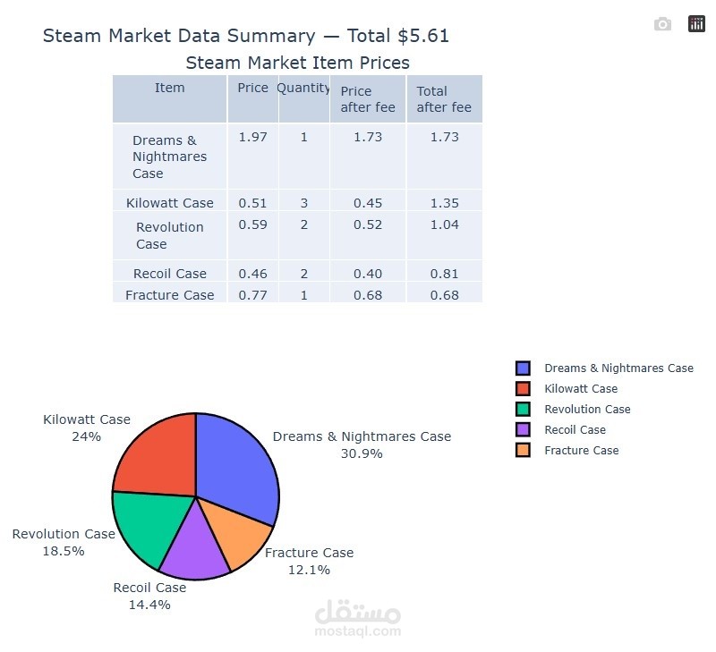 مشروع برمجي بلغة Python يهدف إلى أتمتة عملية جمع وتحليل أسعار أي عناصر متوفرة في سوق Steam Community Market.