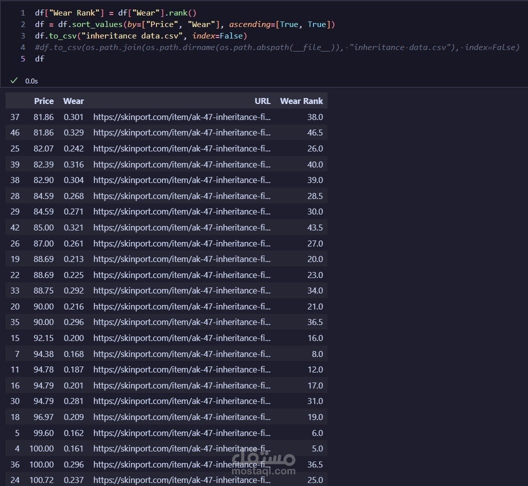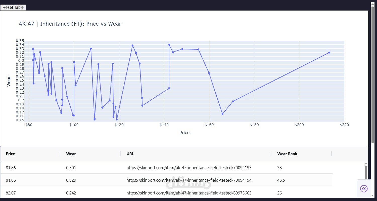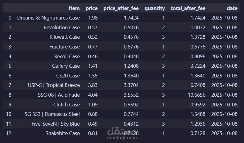 يتيح النظام للمستخدم استخلاص الأسعار مباشرة من السوق باستخدام Selenium، مع حساب القيمة الصافية بعد خصم رسوم Steam (12٪)، وتخزين البيانات بشكل دوري في ملفات CSV لمتابعة تغيّر الأسعار بمرور الوقت.