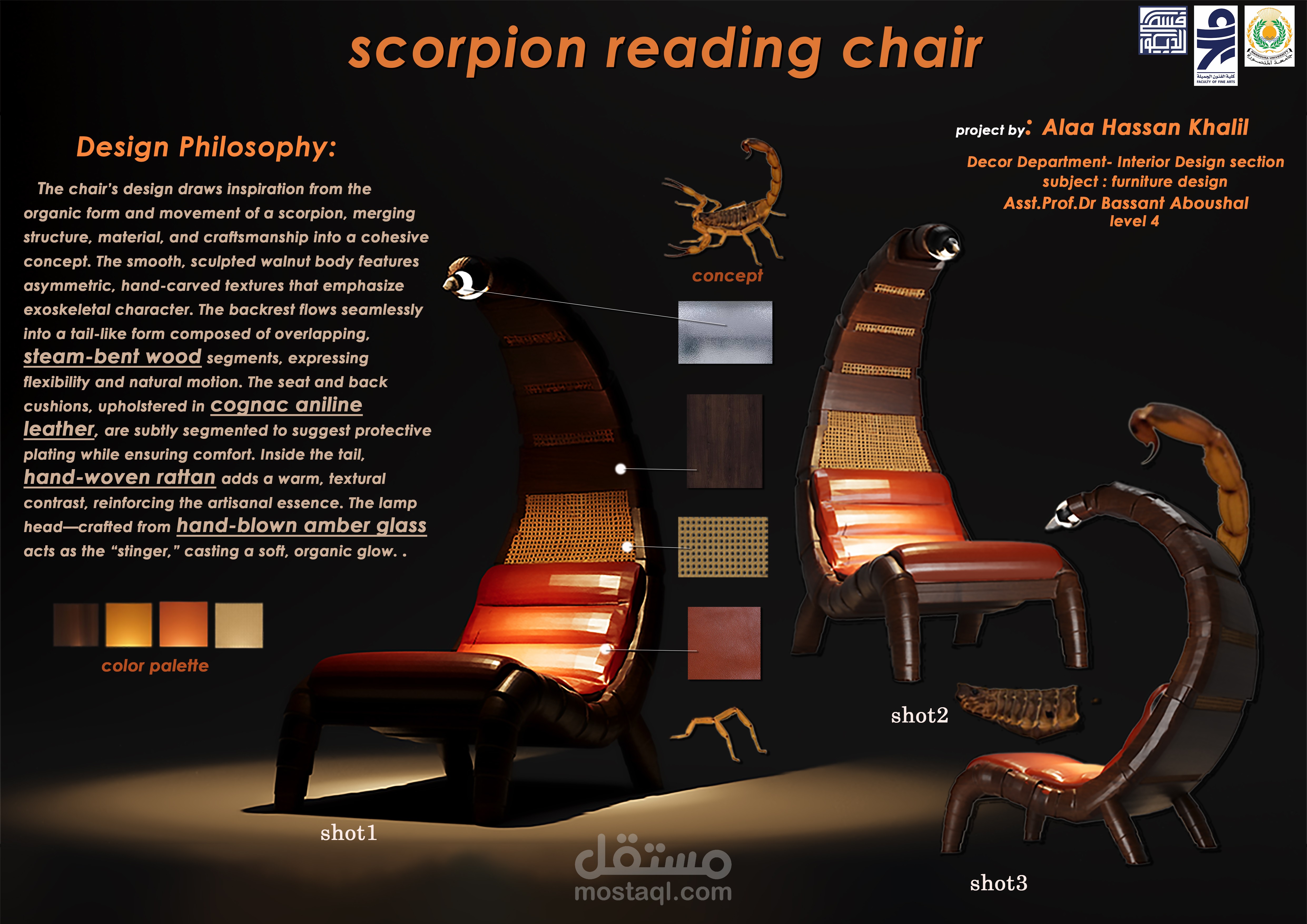 يستوحي تصميم الكرسي فكرته من الشكل والحركة العضوية للعقرب، حيث يدمج بين الهيكل والخامة والحِرَفية في مفهوم متكامل. يتميز الجسم الخشبي المصنوع من الجوز المنحوت والمصقول بأسطح غير متناظرة تُبرز الطابع اليدوي والمظهر الهيكلي الخارجي. يمتد مسند الظهر بانسيابية ليشكل الذيل المصمم من شرائح خشبية منحنية بالبخار ومتداخلة، معبّرًا عن المرونة والحركة الطبيعية. أما المقعد ومسند الظهر المغلفان بجلد الأنيلين بلون الكونياك، فيتّسمان بتقسيمات بسيطة توحي بدرعٍ واقٍ مع الحفاظ على الراحة. ويضيف الخيزران المنسوج يدويًا داخل الذيل تباينًا دافئًا وملمسيًا يعزز الطابع الحرفي. يعمل رأس المصباح المصنوع من الزجاج الكهرماني المنفوخ يدويًا كـ«إبرة» تضفي ضوءًا عضويًا ناعمًا. وتكمل اللمسات المعدنية من البرونز المعتّق التصميم بأناقة ترابية. في المجمل، يحتفي الكرسي بالفن الطبيعي والحرفة والتوازن بين القوة والأناقة المستوحاة من الأشكال العضوية.