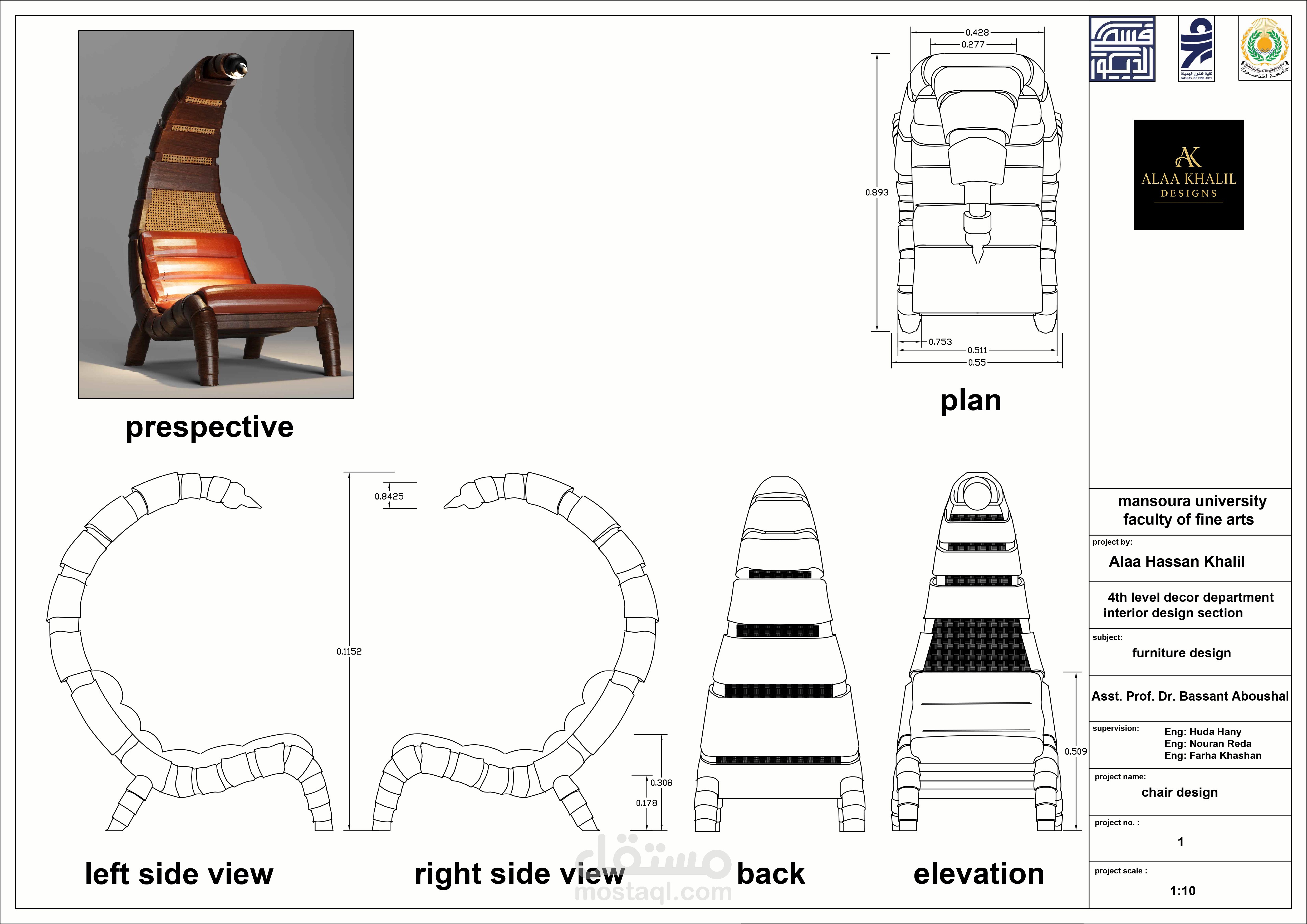 Autocad: إعداد المخططات الثنائية الأبعاد (2D) لرسم الأبعاد الدقيقة للكرسي وتحديد نسب التكوين العامة.