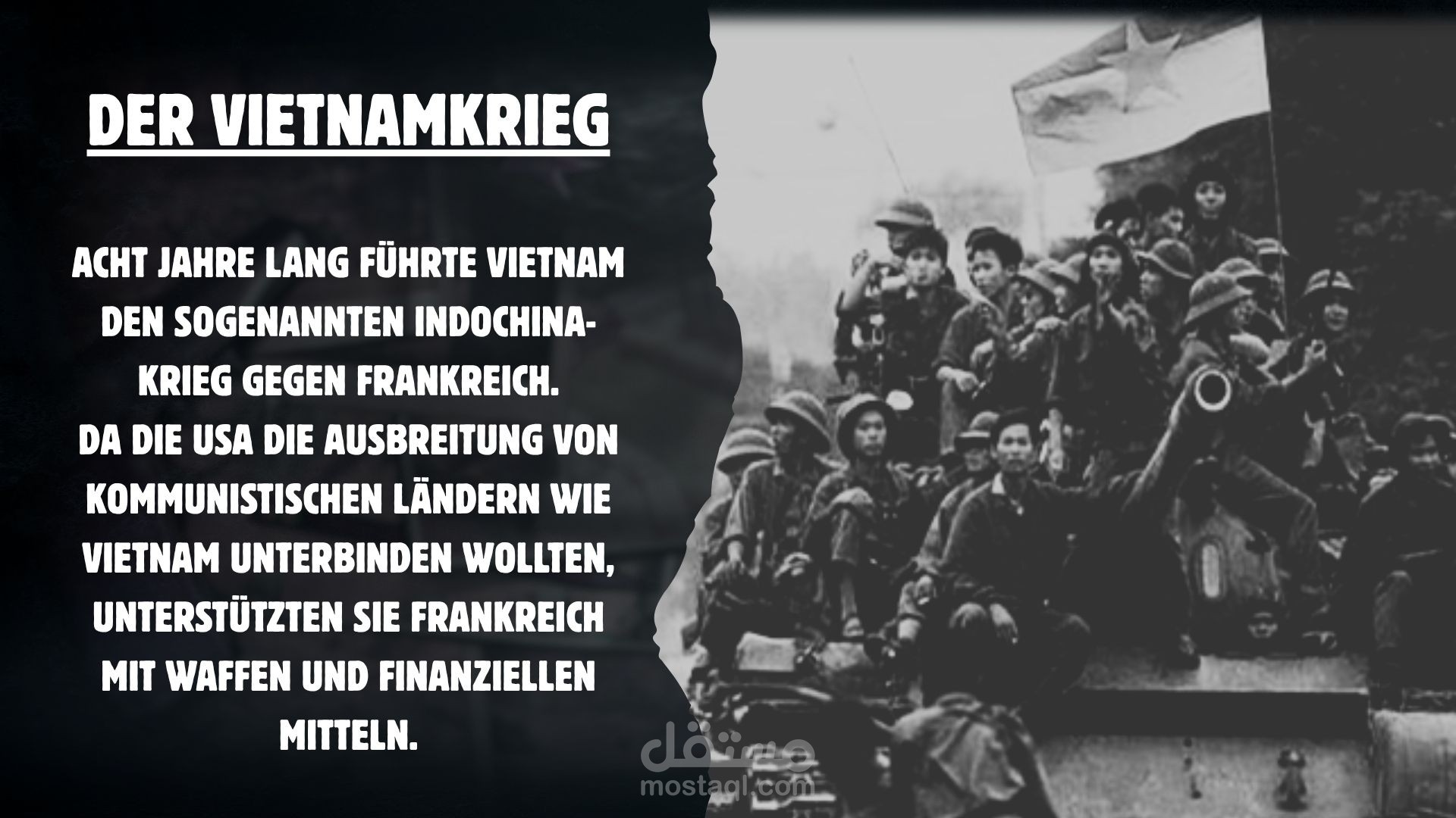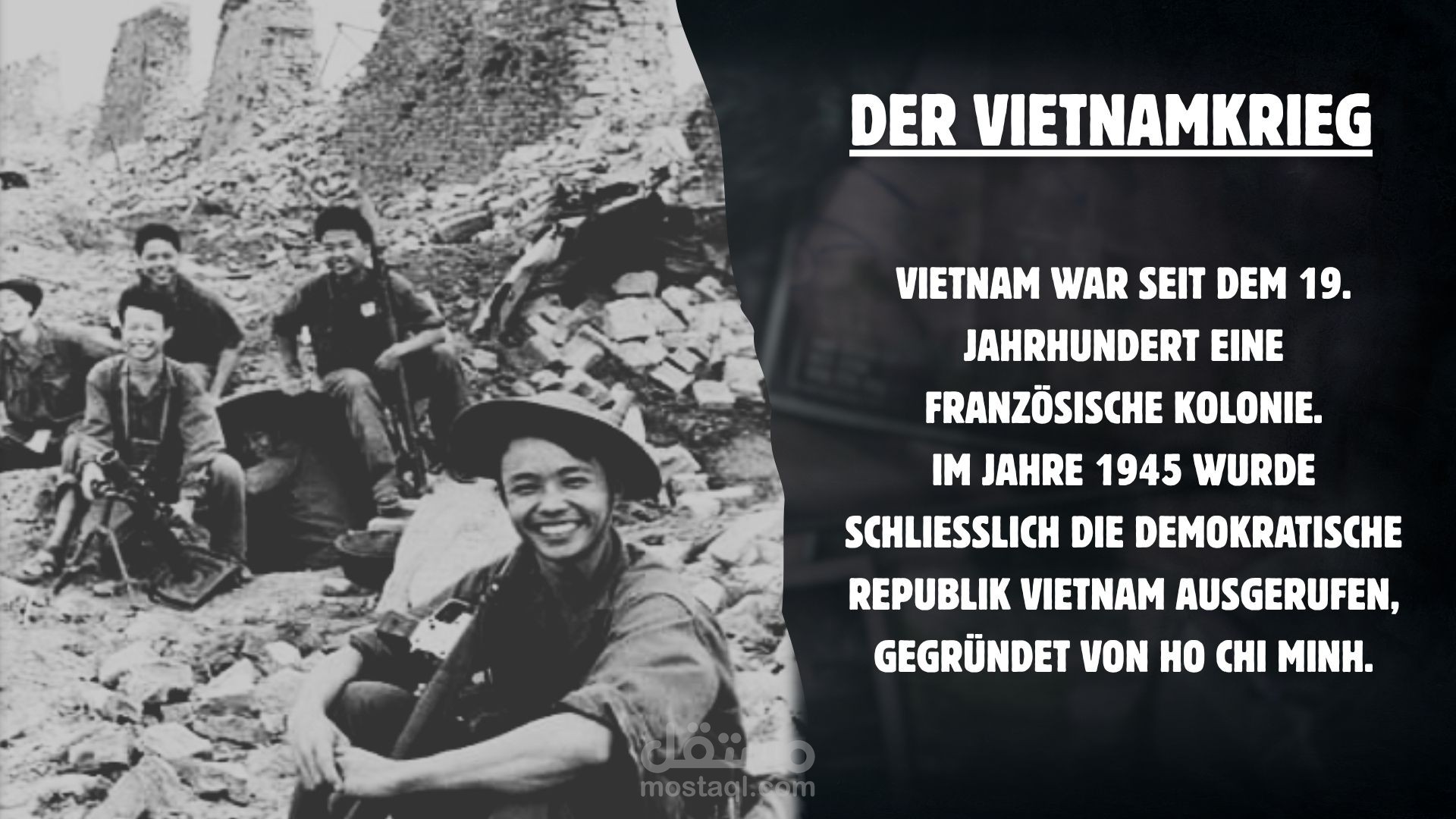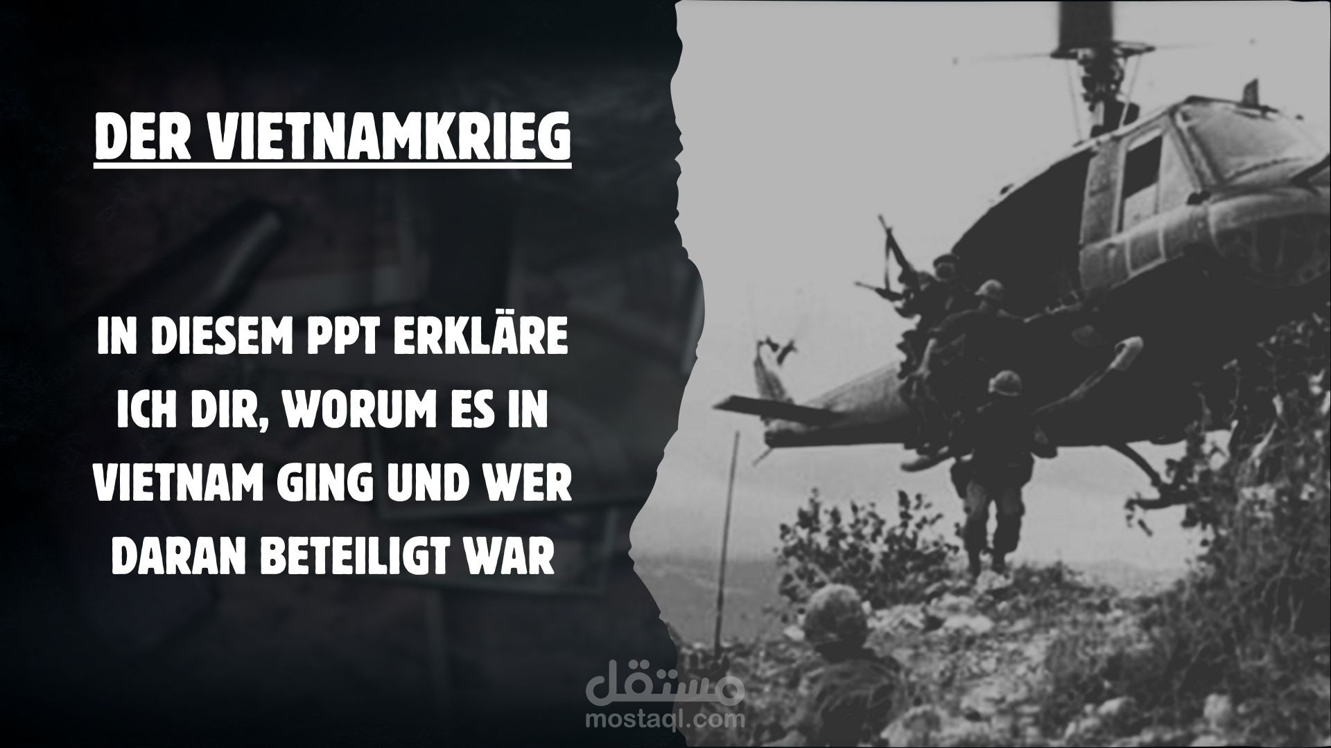 قمت بإعداد وتصميم عرض تقديمي باللغة الألمانية بعنوان „Der Vietnamkrieg“ (حرب فيتنام)، يشرح الأحداث التاريخية والسياسية للحرب بطريقة أكاديمية مبسطة ومنظمة بصريًا.