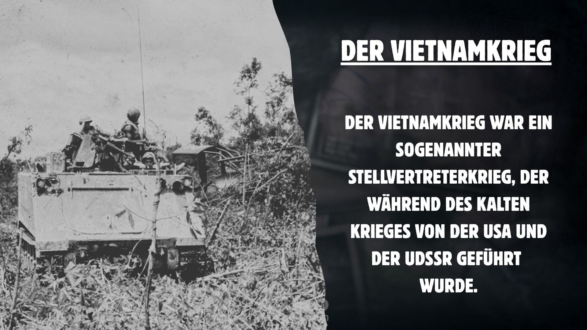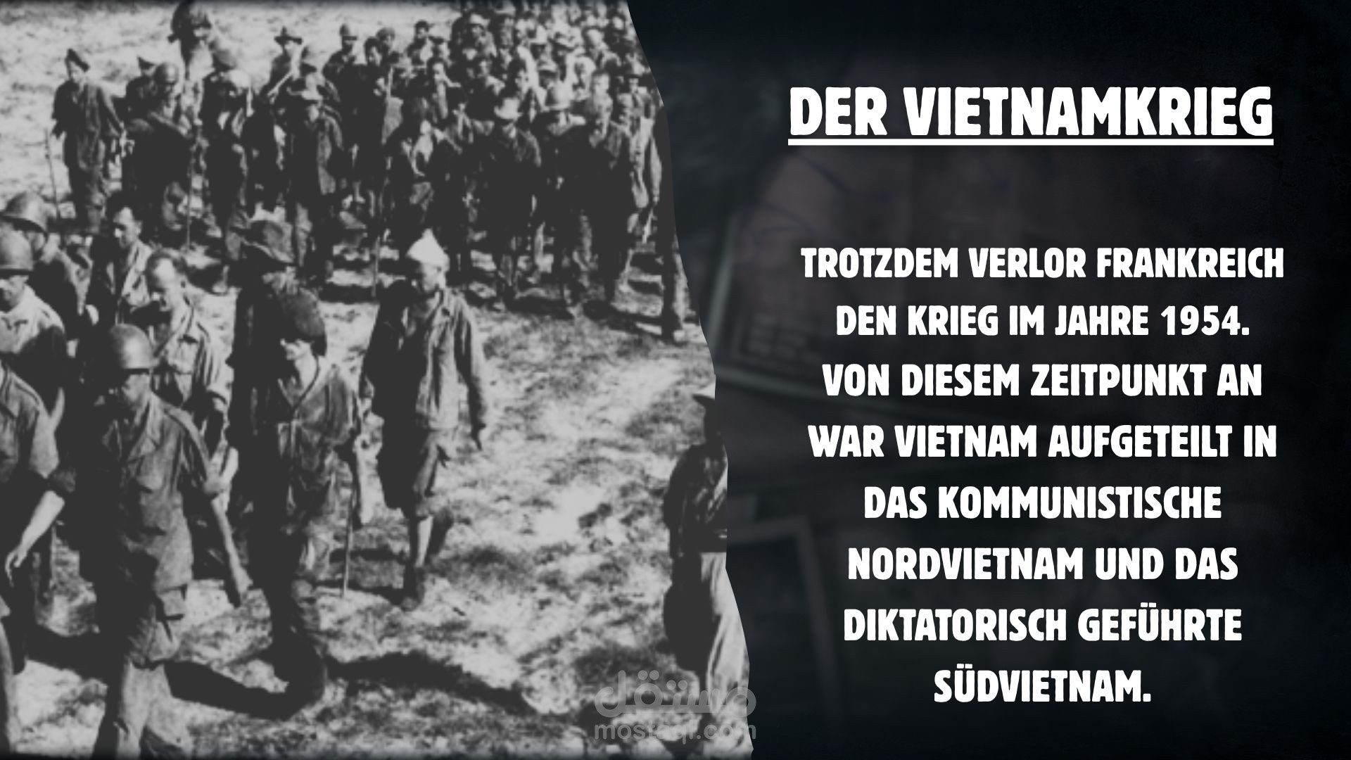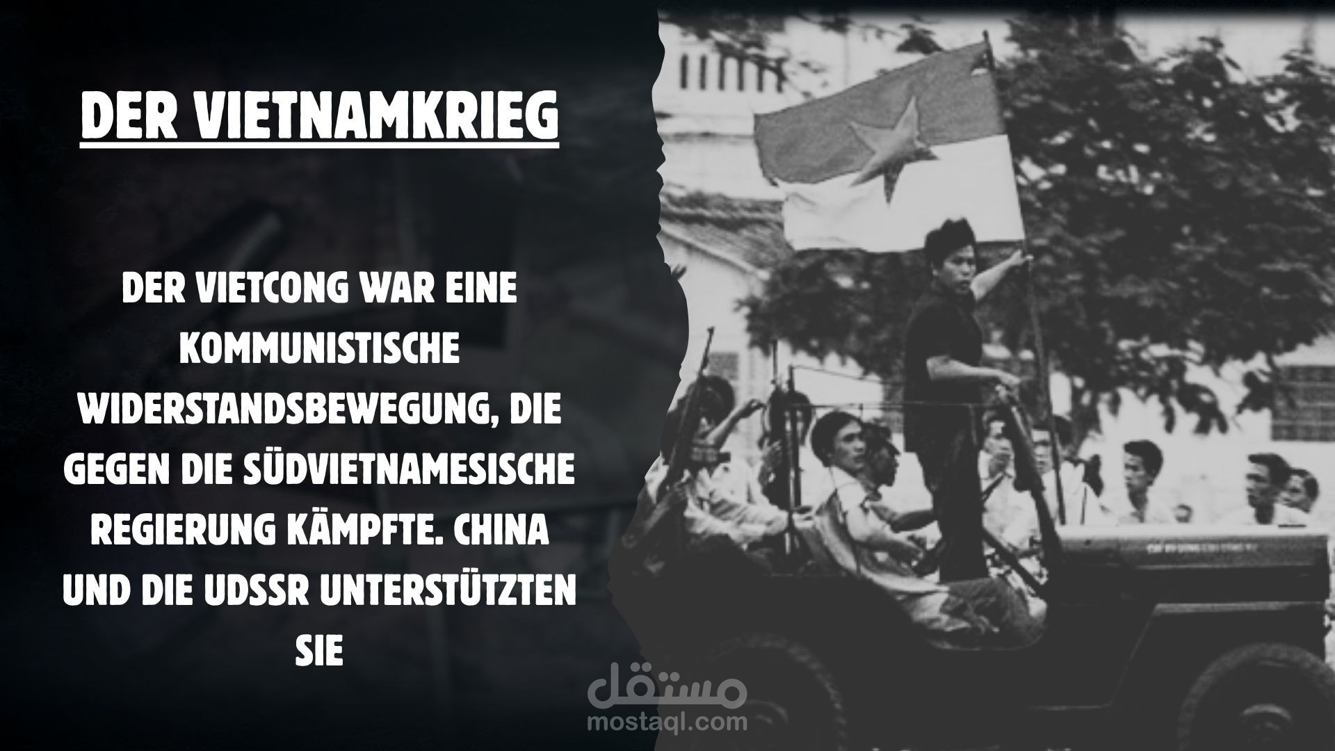 قمت بإعداد وتصميم عرض تقديمي باللغة الألمانية بعنوان „Der Vietnamkrieg“ (حرب فيتنام)، يشرح الأحداث التاريخية والسياسية للحرب بطريقة أكاديمية مبسطة ومنظمة بصريًا.