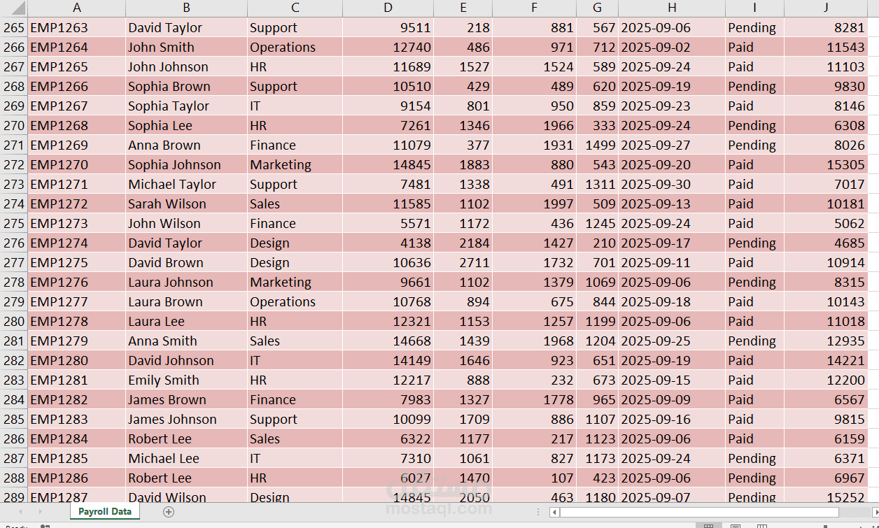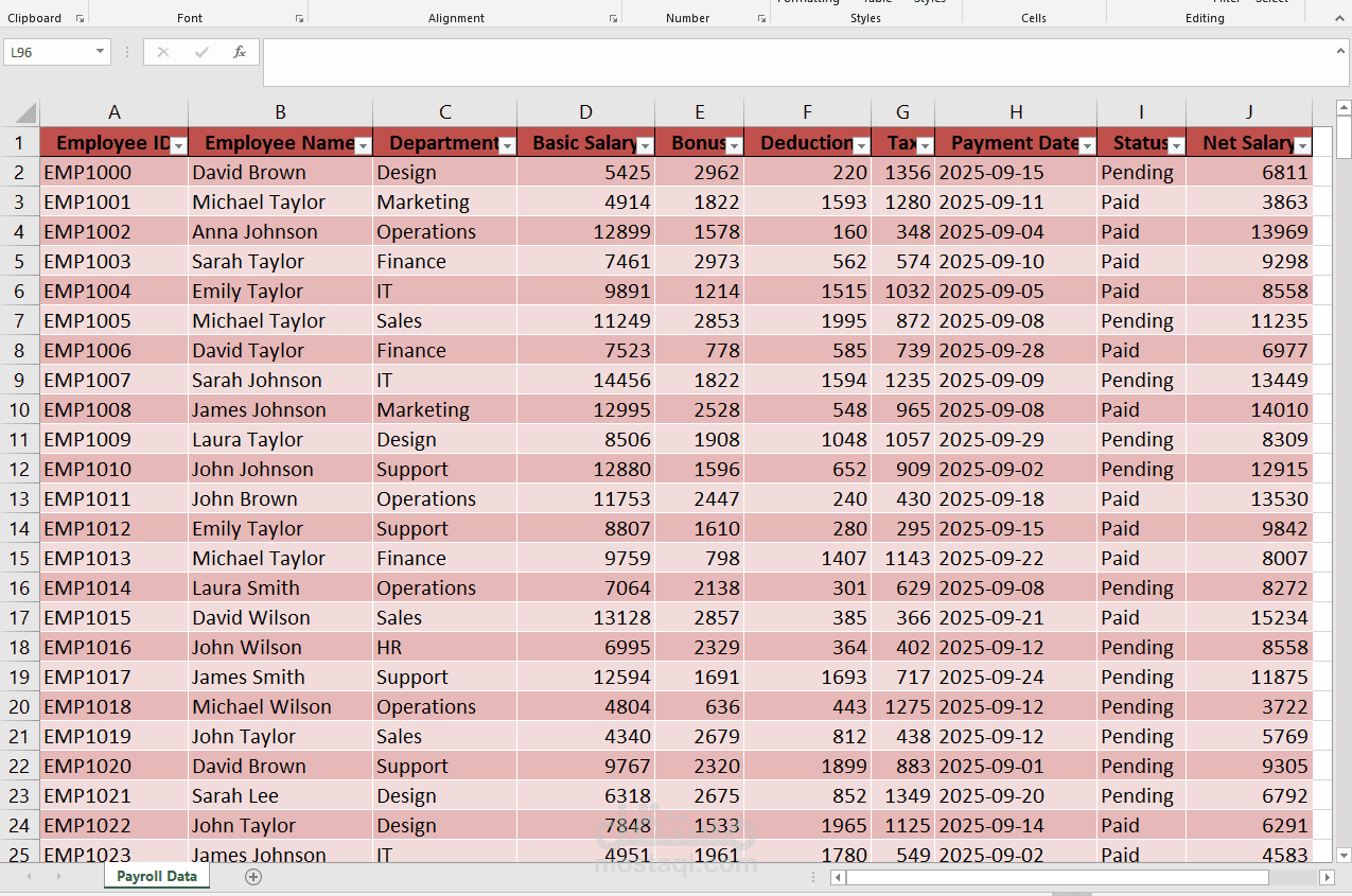 This project focuses on building a detailed Employee Payroll Management System in Excel to efficiently track, manage, and analyze salary data for company staff. The dataset includes 400 employee records, each containing complete payroll information such as department, salary breakdown, taxes, deductions, and payment status.