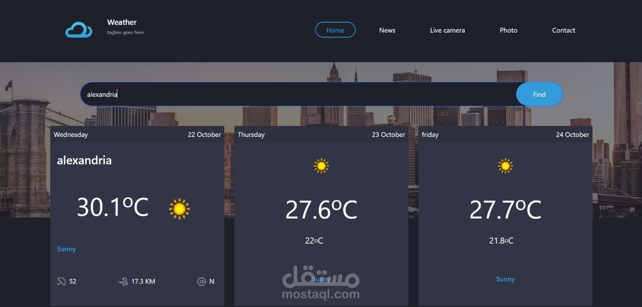 يمكن للمستخدم إدخال اسم المدينة ليعرض التطبيق فورًا درجة الحرارة والرطوبة وحالة الطقس الحالية من خلال واجهة بسيطة ومتجاوبة.