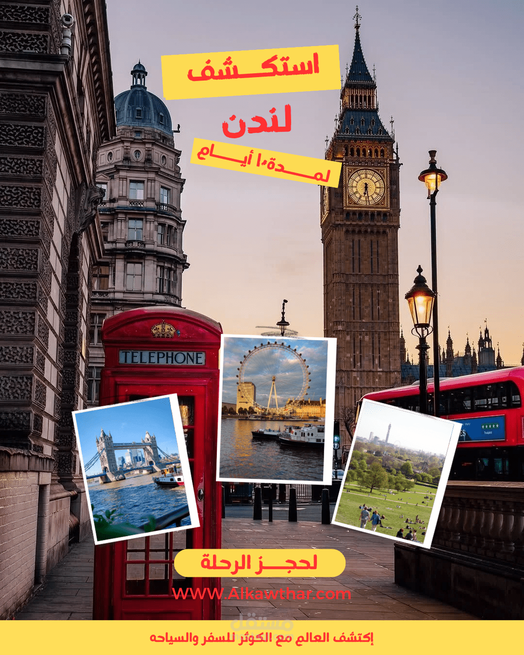 العمل يشمل تصاميم متنوعة لمواسم مختلفة (العروض الصيفية – العروض الأسبوعية – رحلات لندن)، ويُبرز مهارة التنسيق بين الصور والنصوص بأسلوب يحفّز العملاء على الحجز والتفاعل عبر وسائل التواصل الاجتماعي.