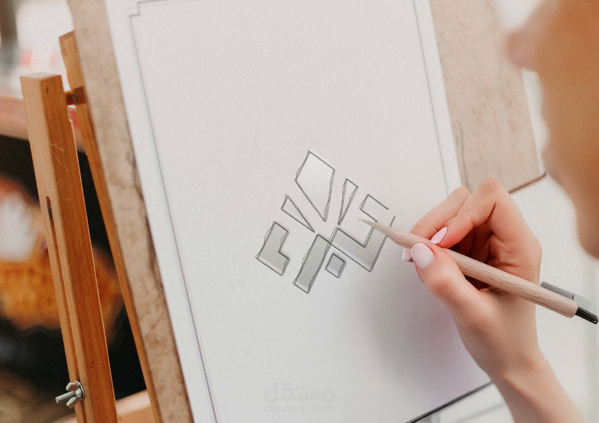 رسم الاسكتشات الأولية يدويًا مع التركيز على حرف (الفاء) بحيث يمتد الألف تحته كخط أنيق يربط الحروف.
