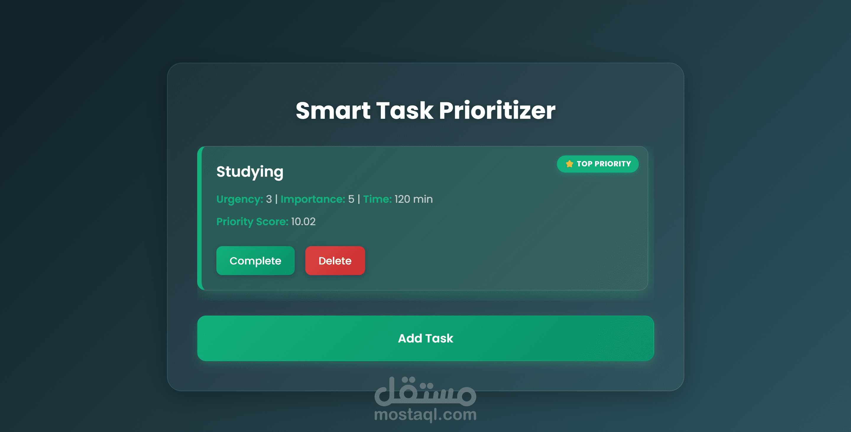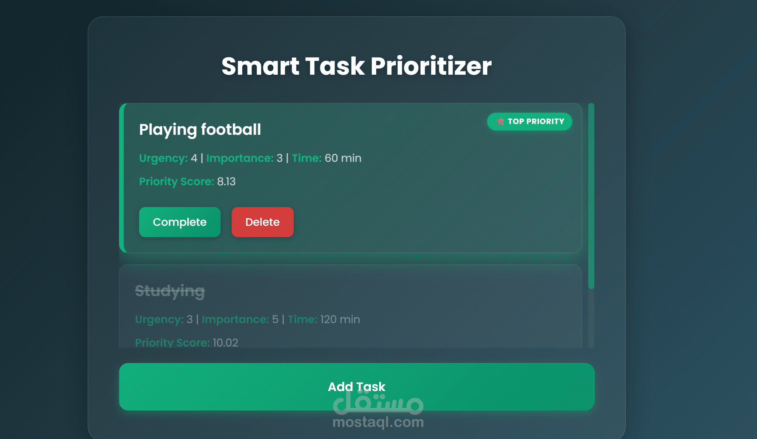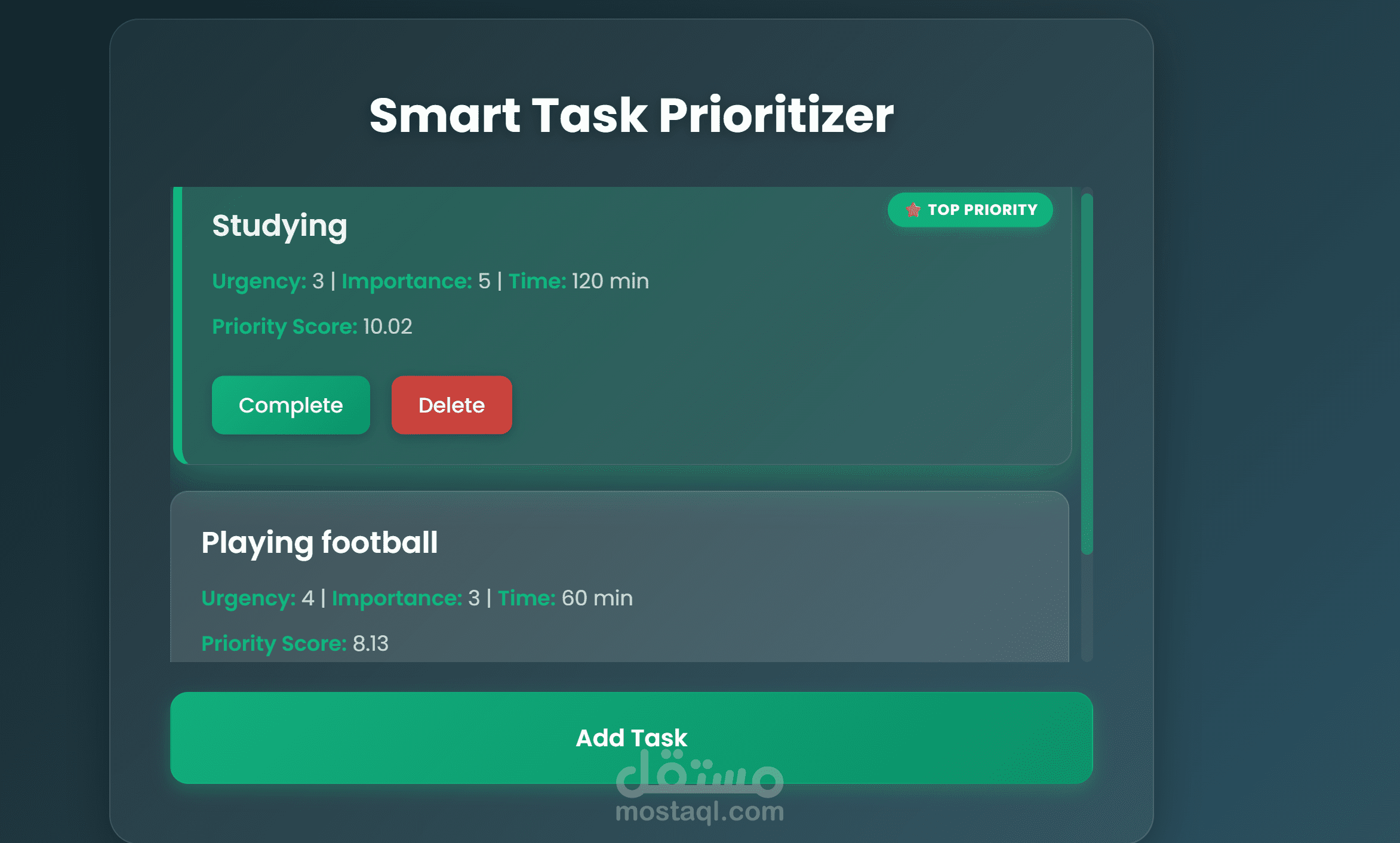 تطبيق ويب بسيط وفعّال يتيح لك إدارة مهامك بطريقة ذكية، حيث يقوم بحساب أولوية كل مهمة اعتمادًا على مدى الأهمية والإلحاح والمدة الزمنية المتوقعة. يعتمد التطبيق على خوارزمية بسيطة لتحديد الأولويات تلقائيًا، مما يساعدك على معرفة أي المهام يجب تنفيذها أولًا.