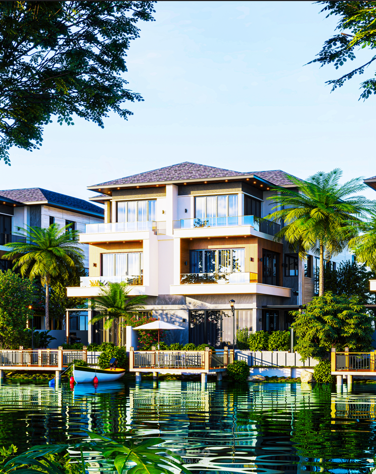A luxurious architectural design that blends modernity with nature. The villa is situated on the edge of a calm canal, featuring a refined façade that combines white finishes with natural wood accents. Expansive glass windows span all floors, offering panoramic views and abundant natural light.