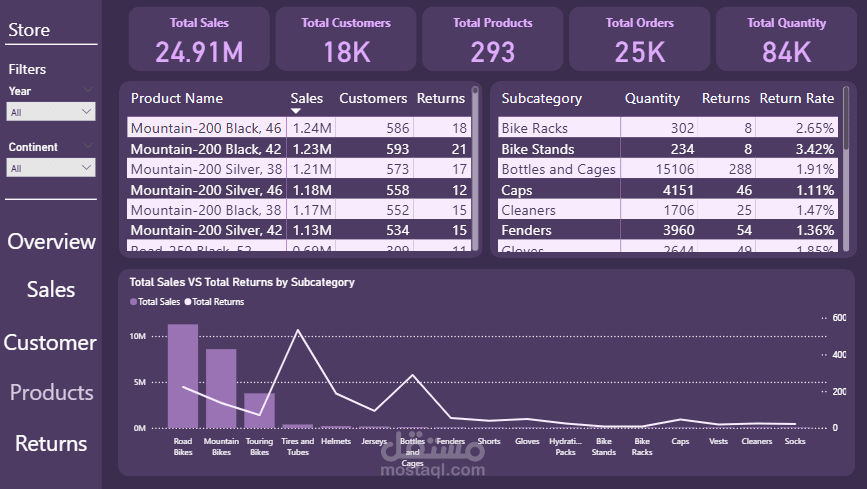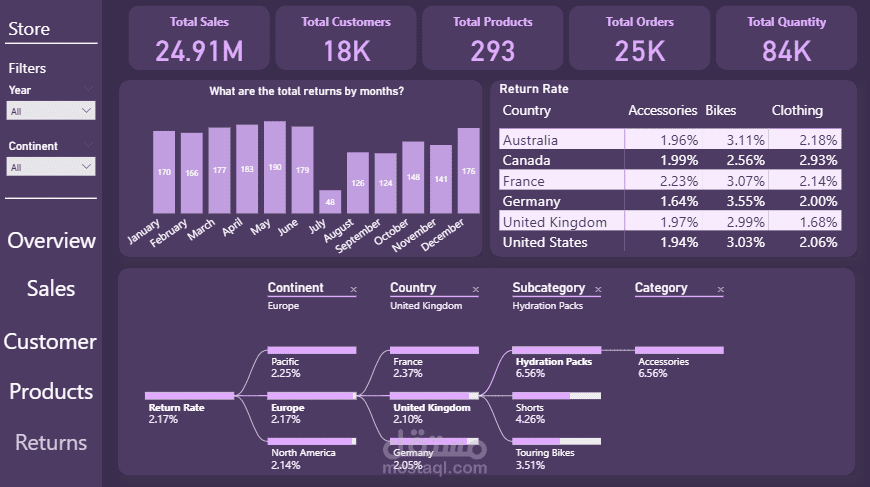 - صفحة المرتجعات: تستخدم "شجرة التحليل" (Decomposition Tree) لتحديد الأسباب الجذرية لارتفاع المرتجعات.