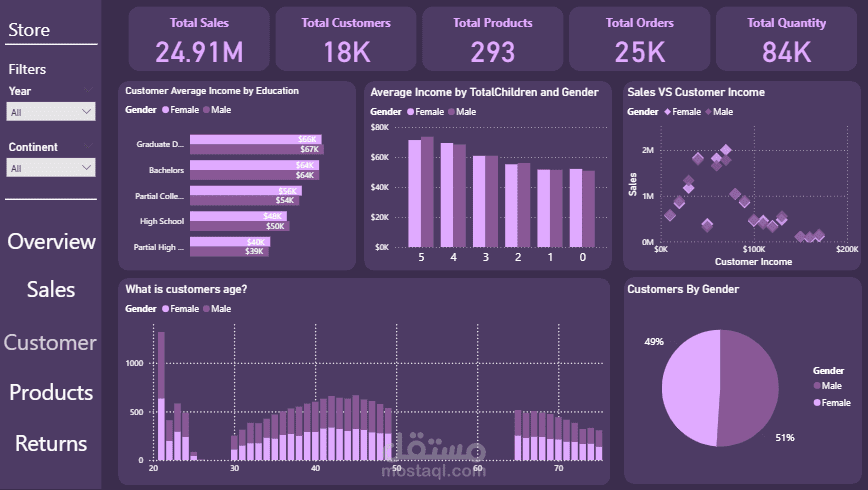 - صفحة العملاء: لتحليل الخصائص الديموغرافية (العمر، الدخل، النوع).
