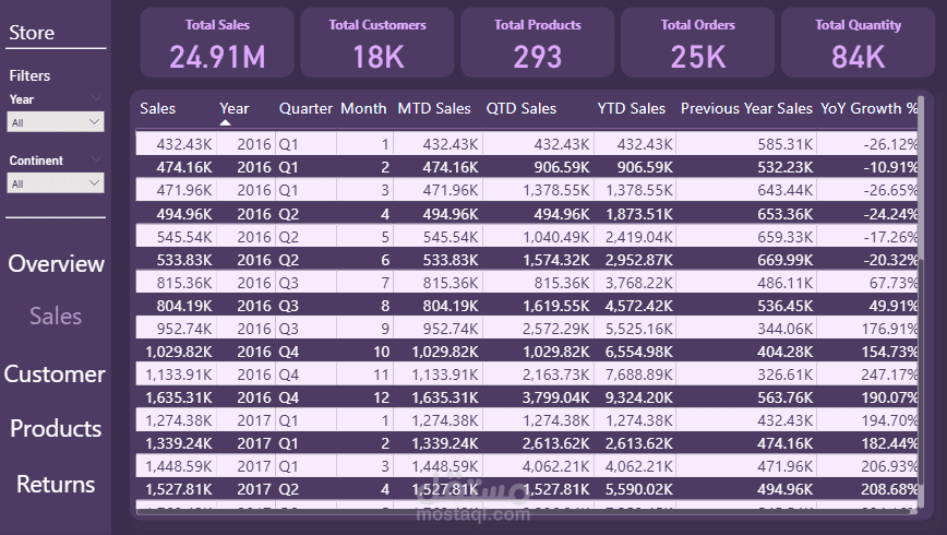 - تم تطبيق مقاييس الذكاء الزمني (Time Intelligence) لحساب النمو السنوي (YoY) ومقارنة الأداء بالفترات السابقة (YTD, QTD, MTD).