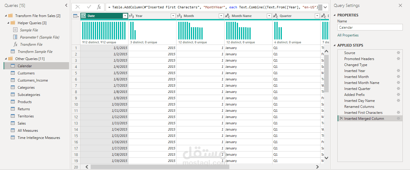 - تم تنظيف وتحويل جميع البيانات (ETL) باستخدام Power Query، بما في ذلك إنشاء جدول تقويم ديناميكي لتمكين التحليل الزمني.