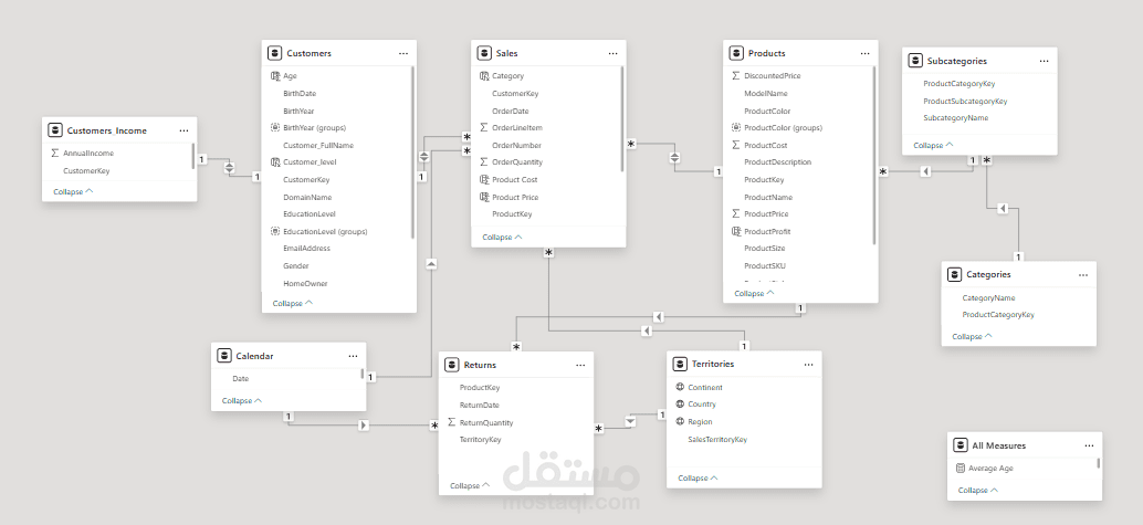 - تم بناء نموذج بيانات قوي (Data Model) يعتمد على مخطط النجمة (Star Schema)، حيث تم ربط جداول الحقائق الأساسية (المبيعات والمرتجعات) بجداول الأبعاد المحيطة بها (العملاء، المنتجات، الأقاليم، والزمن).