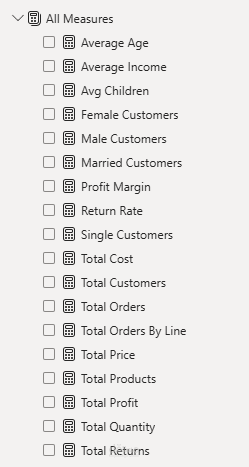 - تمت كتابة جميع الحسابات ومؤشرات الأداء الرئيسية (KPIs) باستخدام مقاييس DAX المتقدمة، وتم تجميعها في جدول مركزي لسهولة الإدارة. تشمل هذه المقاييس (إجمالي المبيعات، الأرباح، العملاء، ومعدل المرتجعات).