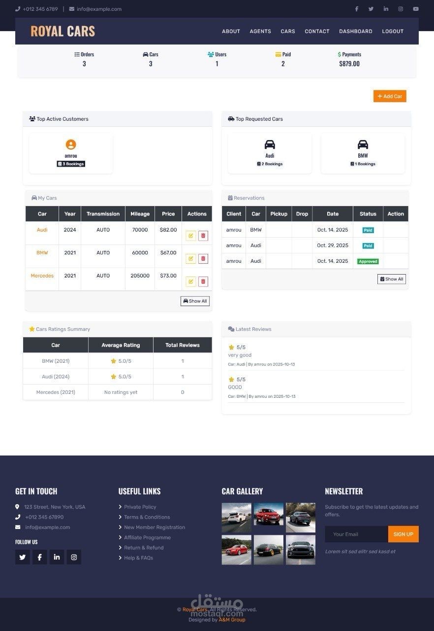 The system is built using Django and MySQL, with a fully responsive frontend powered by Bootstrap 5. It allows users to easily book cars, while administrators can manage vehicles, reservations, and users through a dedicated control panel.