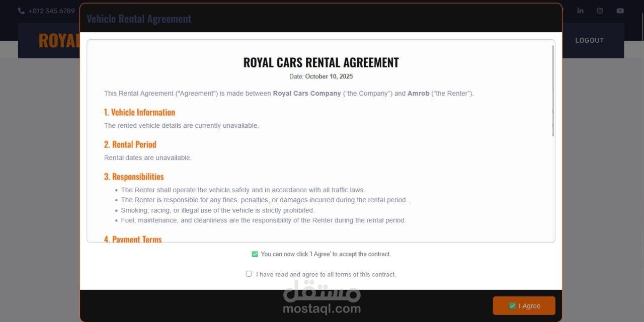 After payment completion, the system automatically generates an electronic contract containing vehicle details, rental duration, and renter responsibilities. The user must digitally approve the agreement before the final booking confirmation.