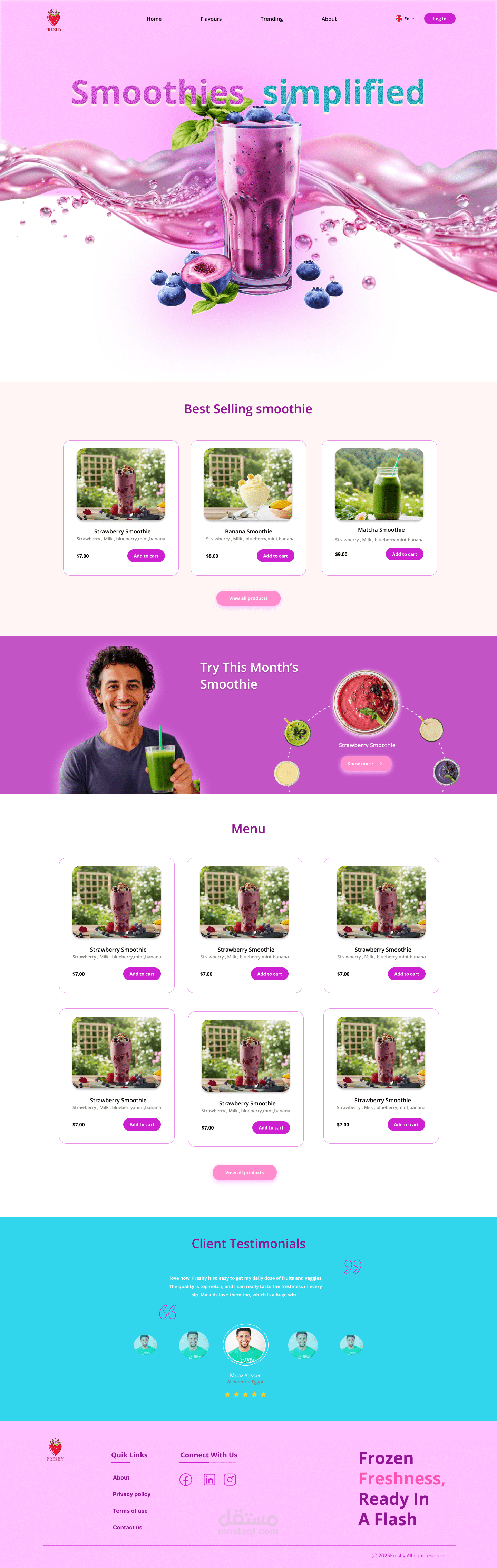 الموقع عبارة عن منصة إلكترونية متخصصة في بيع عصائر السموذي الطبيعية، صُمم ليقدّم تجربة مستخدم سهلة وجذابة تجمع بين البساطة والعصرية. الهدف من المشروع هو توفير واجهة أنيقة ومريحة تساعد المستخدم على استكشاف المنتجات بسهولة واختيار النكهات المفضلة لديهم.