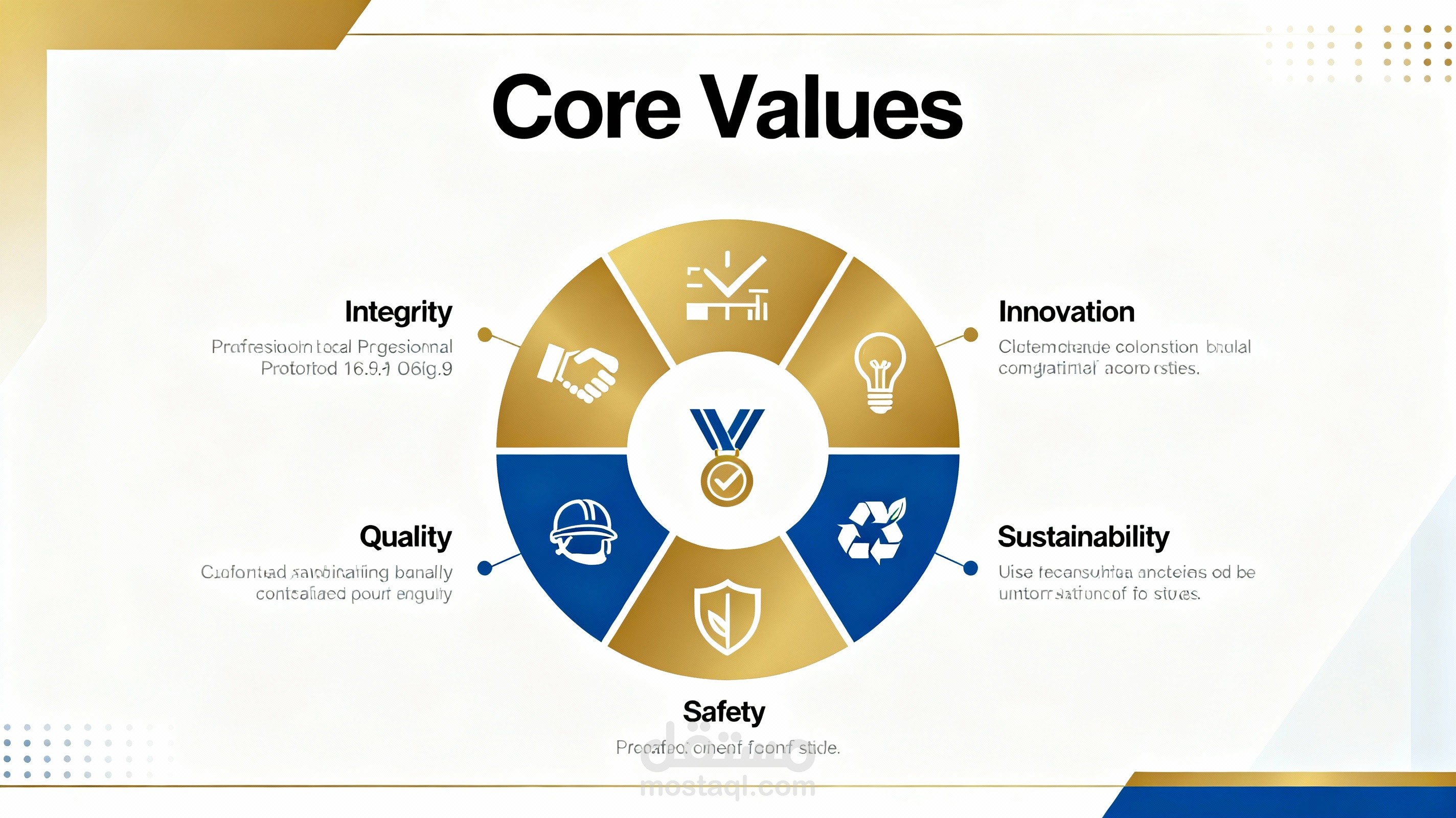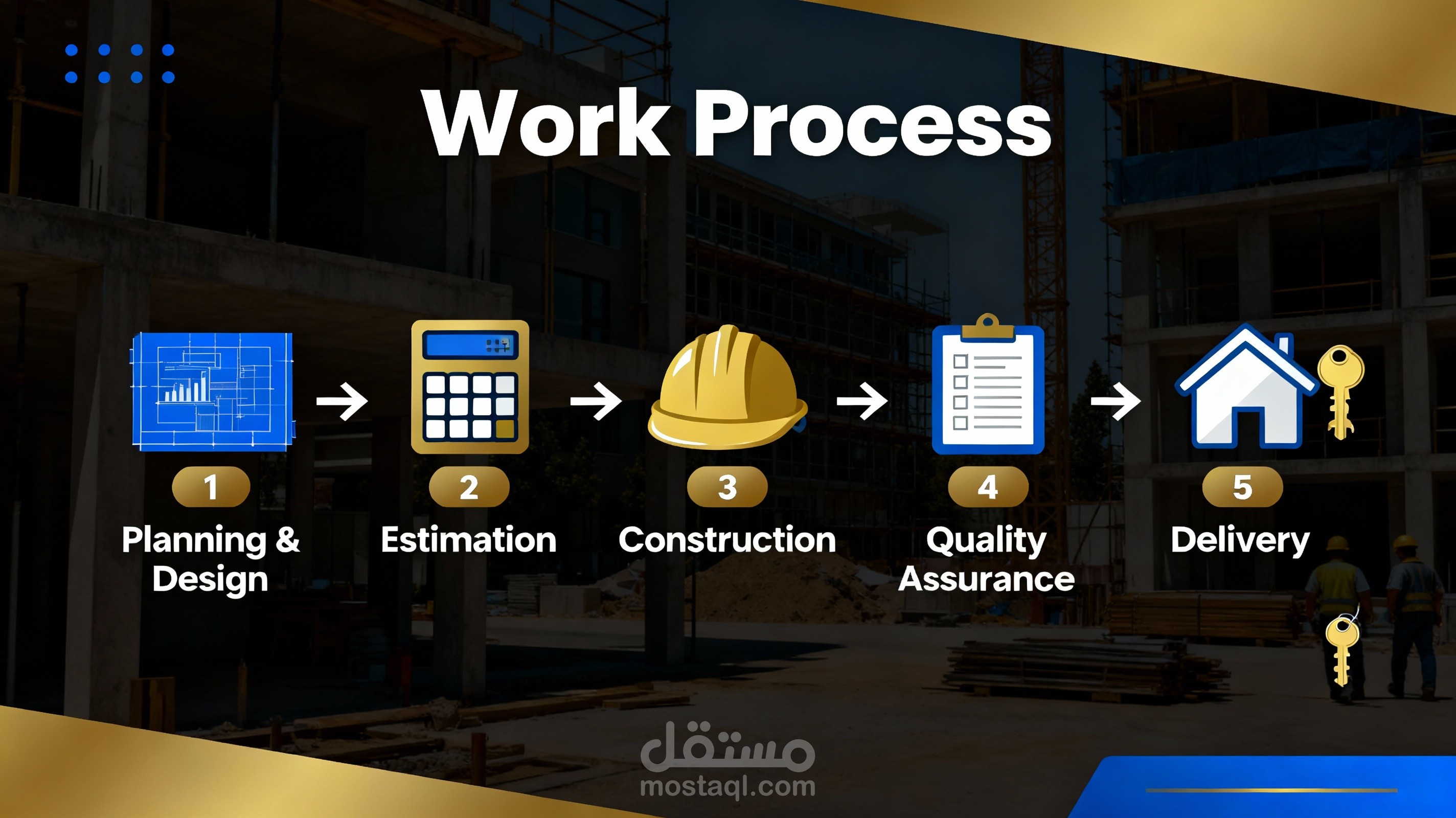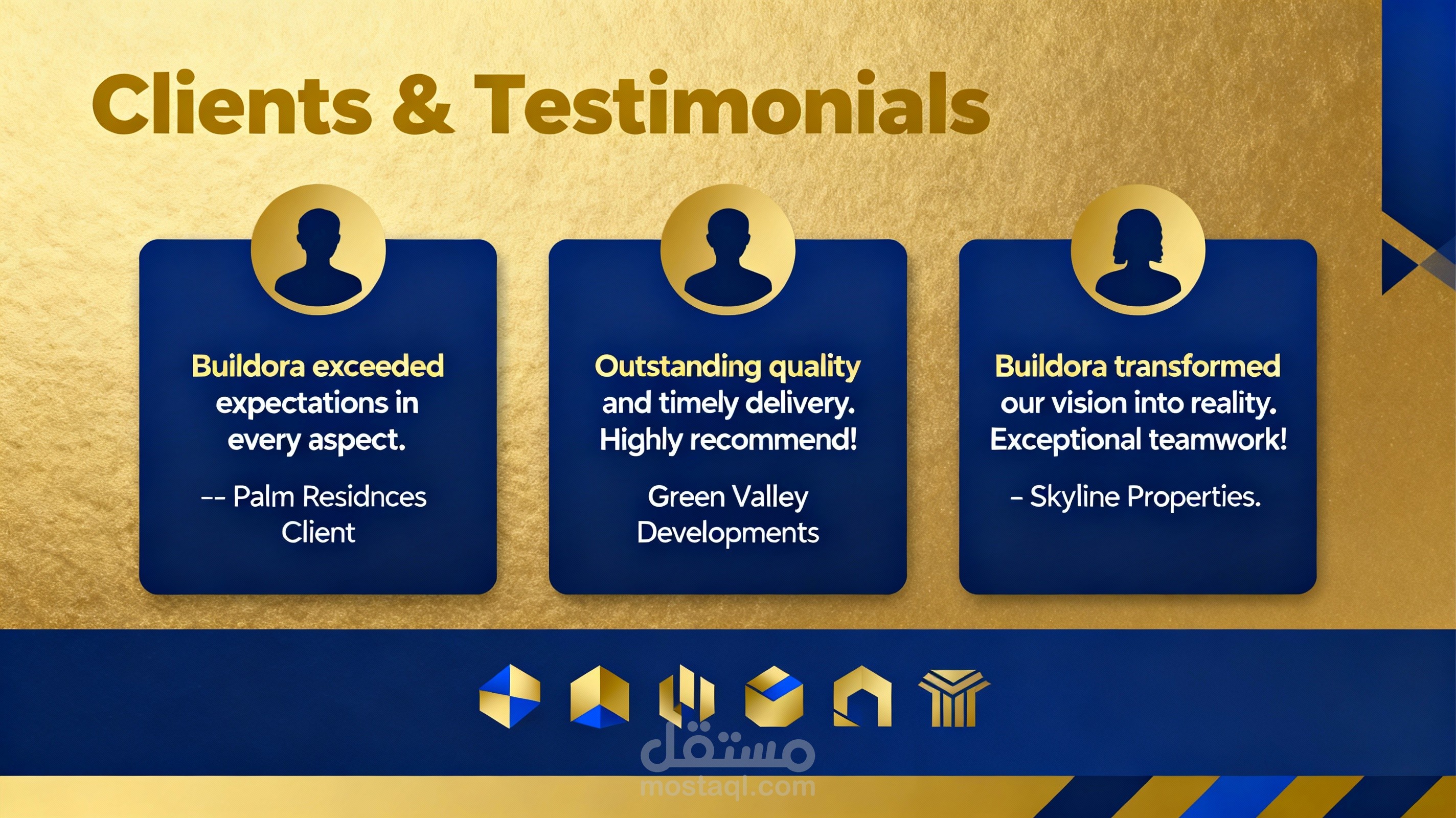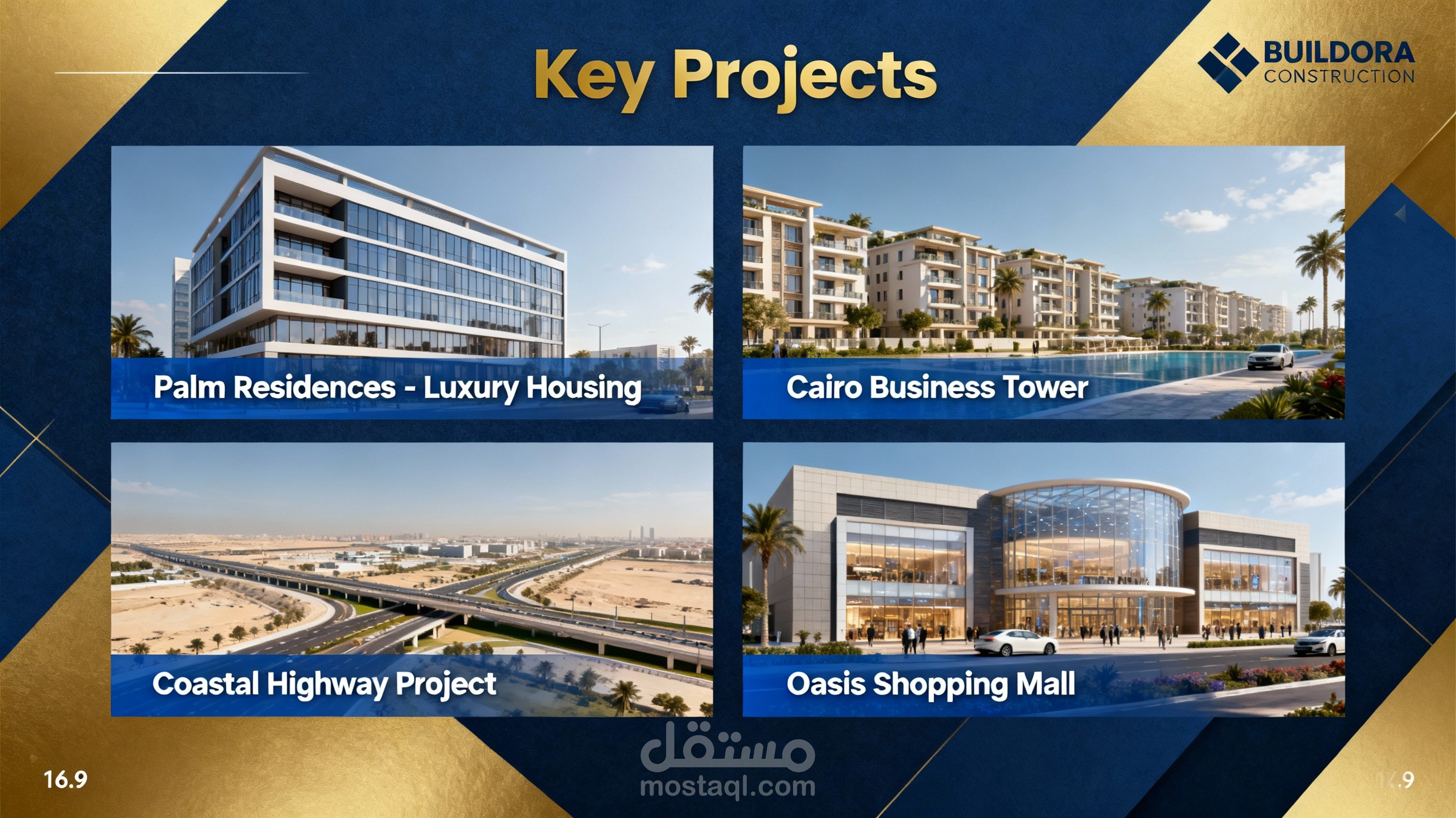 يهدف المشروع إلى تصميم عرض تقديمي (PowerPoint) مكون من 10 شرائح احترافية، لعرض الملف التعريفي الكامل لشركة Buildora Constructions — إحدى الشركات الرائدة في مجال المقاولات في مصر والشرق الأوسط.