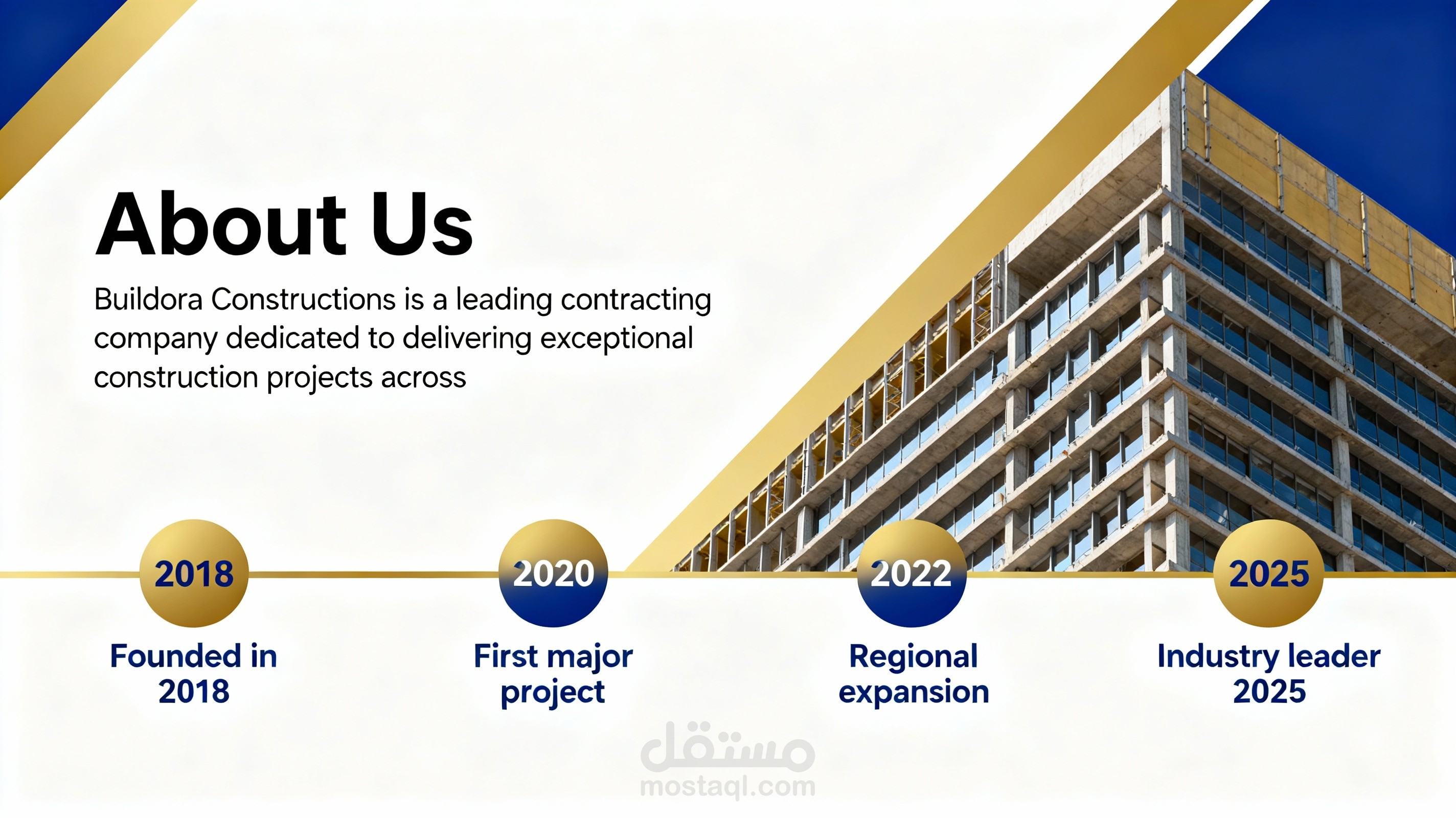 يعكس العرض قوة شركة Buildora Constructions ومكانتها الرائدة في مجال المقاولات، ويُبرز التزامها بالجودة، الموثوقية، والتميز المهني.