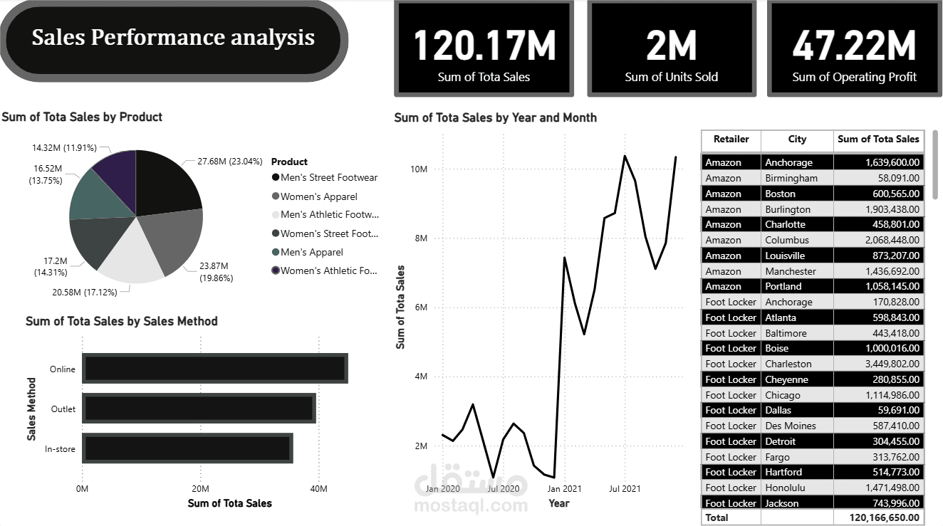 تحليل الأداء الشامل (KPIs): عرض المؤشرات الرئيسية للأداء (KPIs) في صدارة التقرير: إجمالي المبيعات ($120M)، الأرباح ($47M)، والوحدات المباعة (2M).