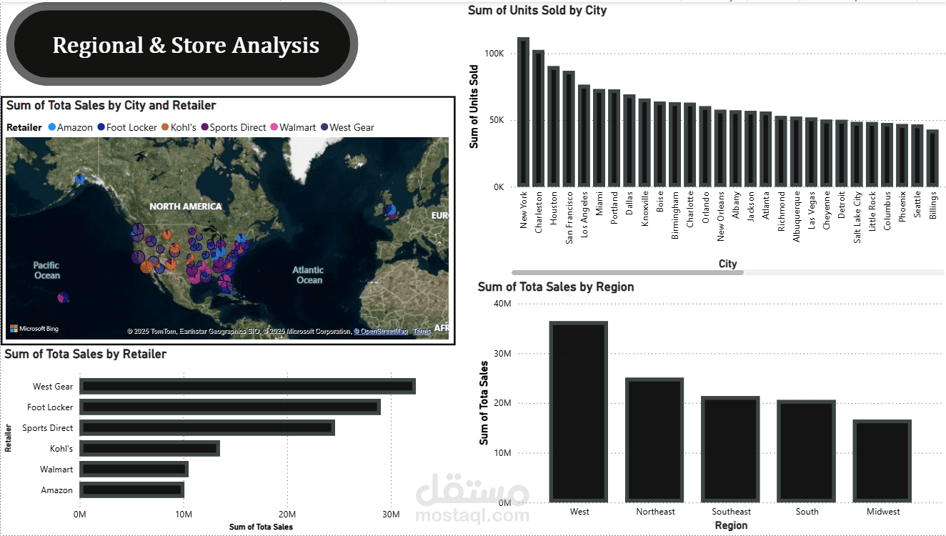 التحليل الجغرافي والمحلي: استخدام الخرائط التفاعلية والرسوم البيانية الشريطية لتحليل المبيعات حسب المناطق الجغرافية والشركاء التجاريين الرئيسيين (Retailers)، مما يسهل اتخاذ قرارات التوسع الإقليمي.