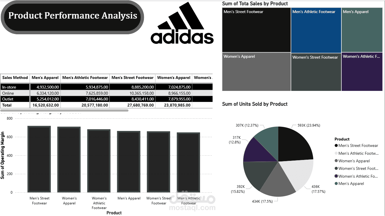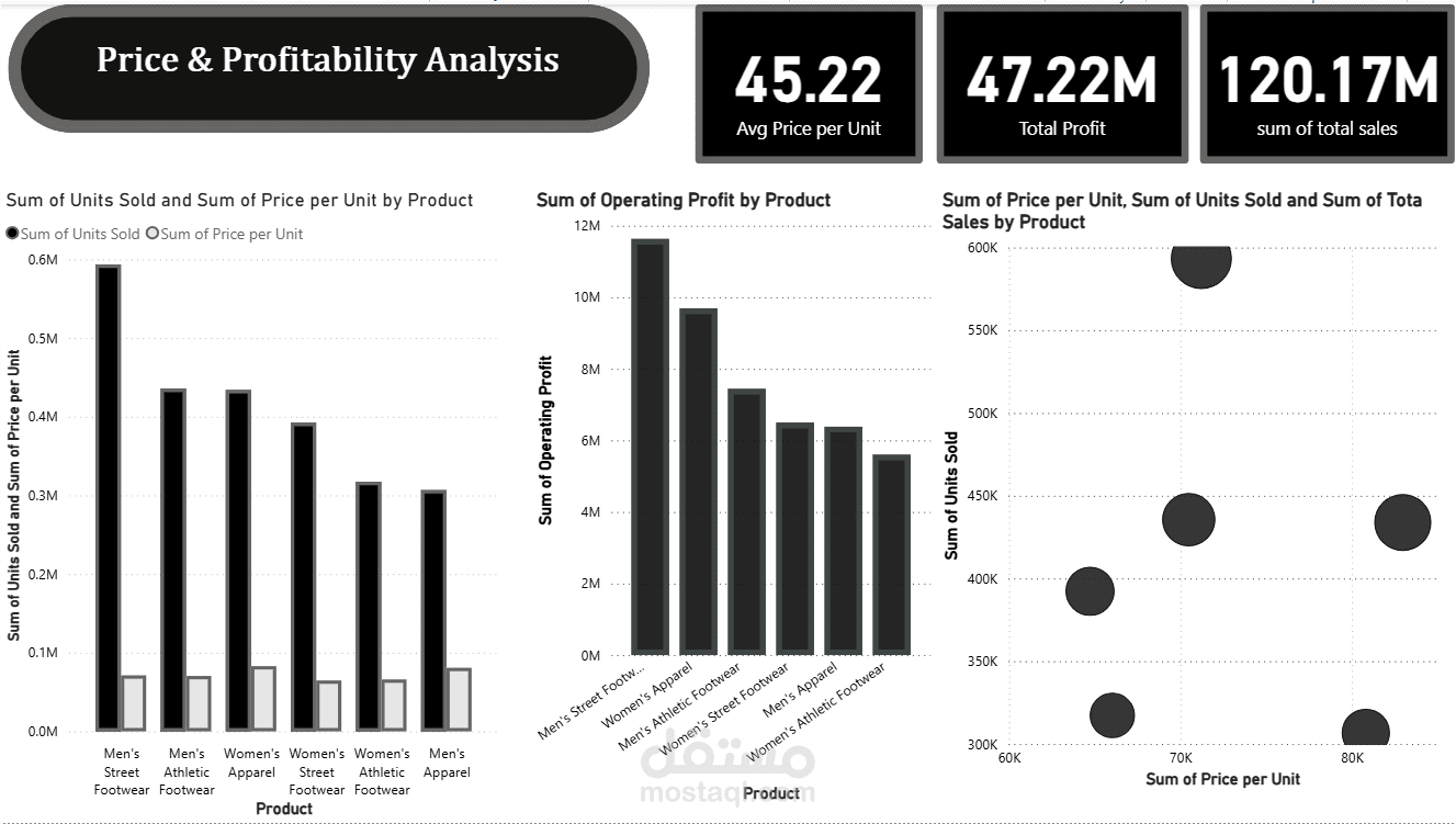 تحليل الربحية والمنتجات: تحليل متعمق يحدد المنتجات الأكثر ربحية (مثل Men's Street Footwear)، ويقارن بين سعر الوحدة وربحيتها وهامش التشغيل.
