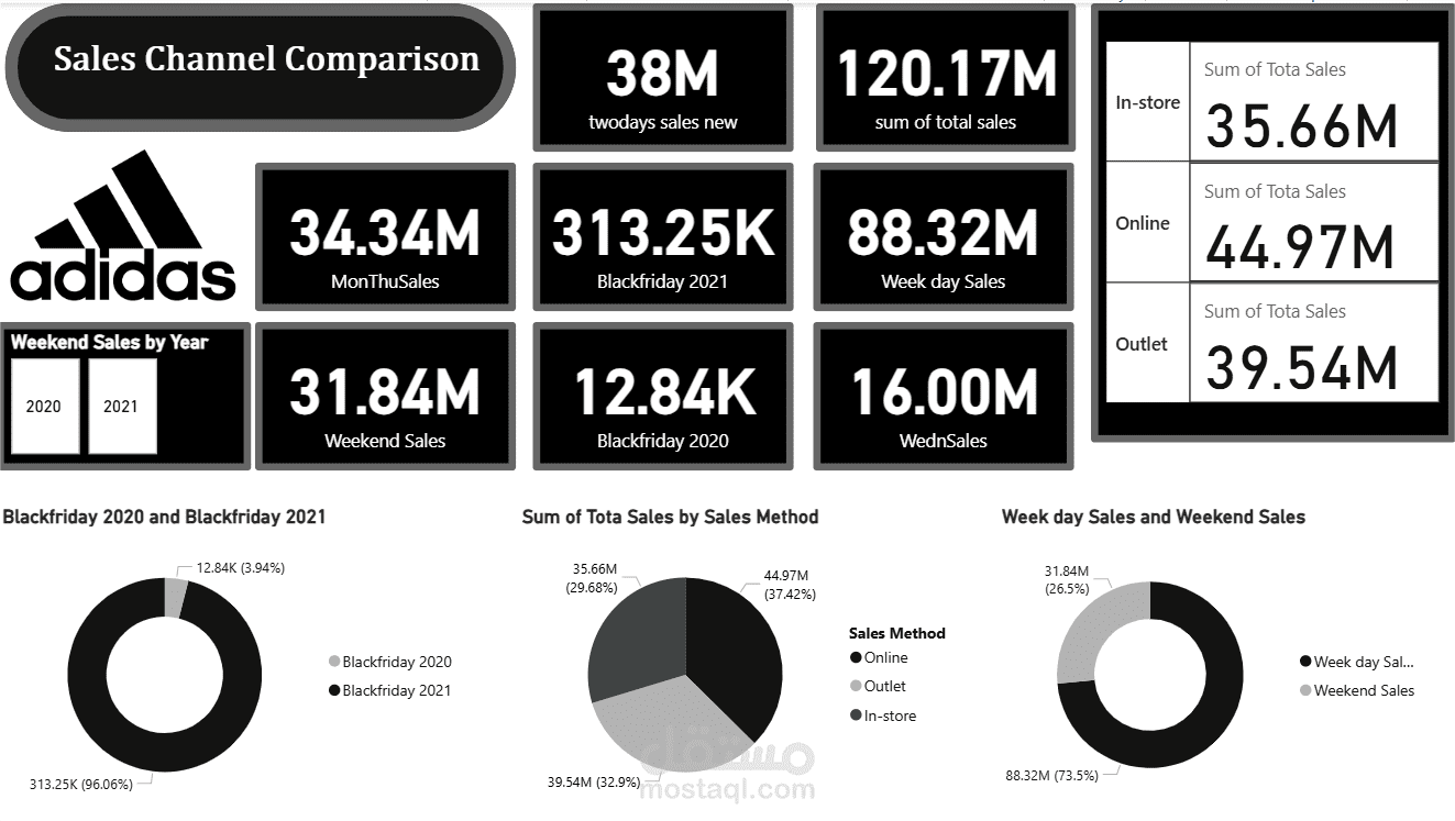 تتبع القنوات والاتجاهات: مقارنة دقيقة بين أداء قنوات البيع (Online, In-store, Outlet) مع إبراز تفوق المبيعات عبر الإنترنت. بالإضافة إلى تتبع الاتجاهات الزمنية وتحديد مواسم الذروة (مثل أداء Black Friday 2021).