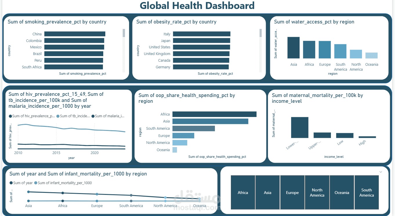 لقد قمت بتصميم هذه اللوحة التفاعلية باستخدام Power BI بهدف تحليل المؤشرات الصحية العالمية ومقارنة الأداء بين الدول والمناطق المختلفة، مما يساهم في فهم العوامل المؤثرة على الصحة العامة عالميًا.