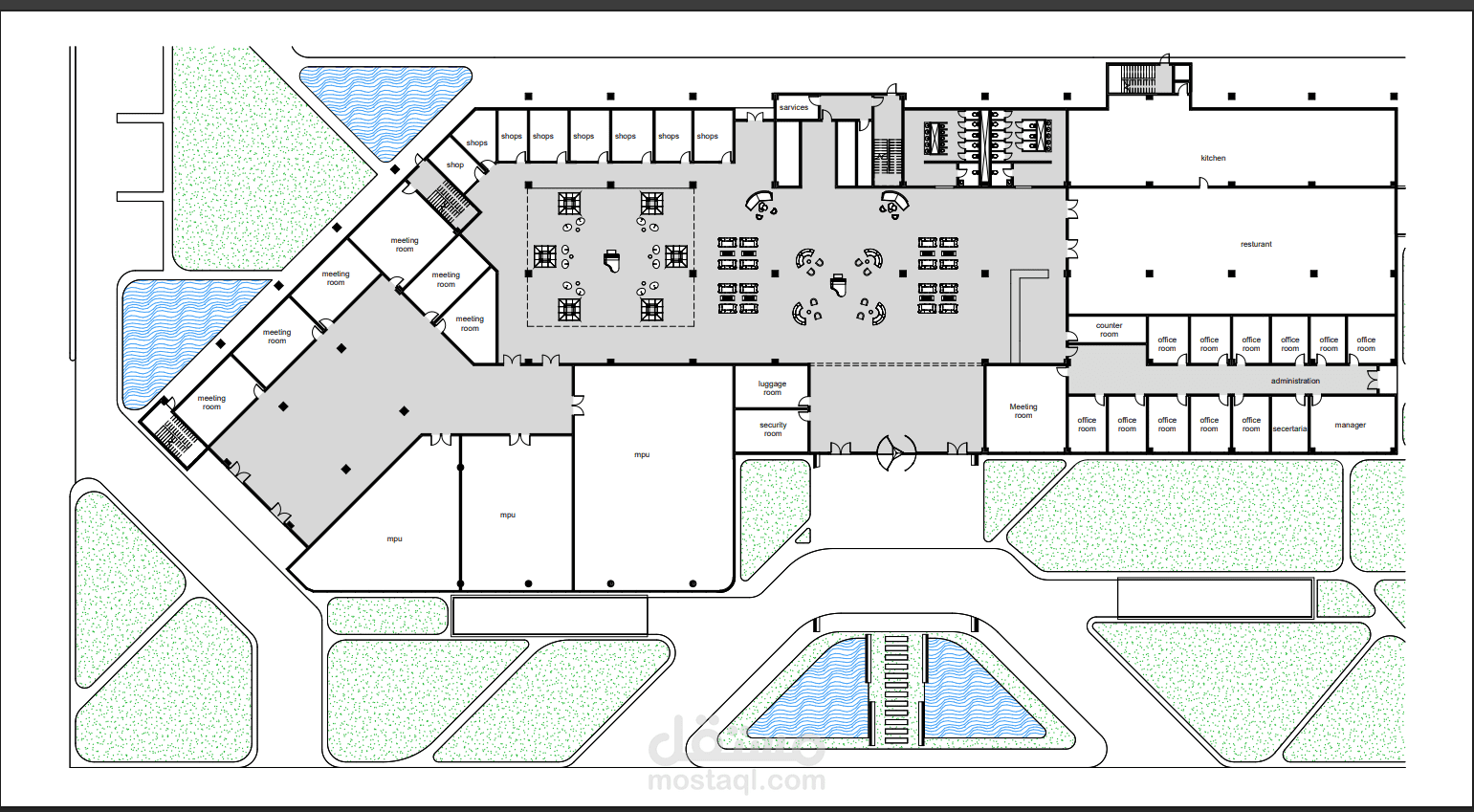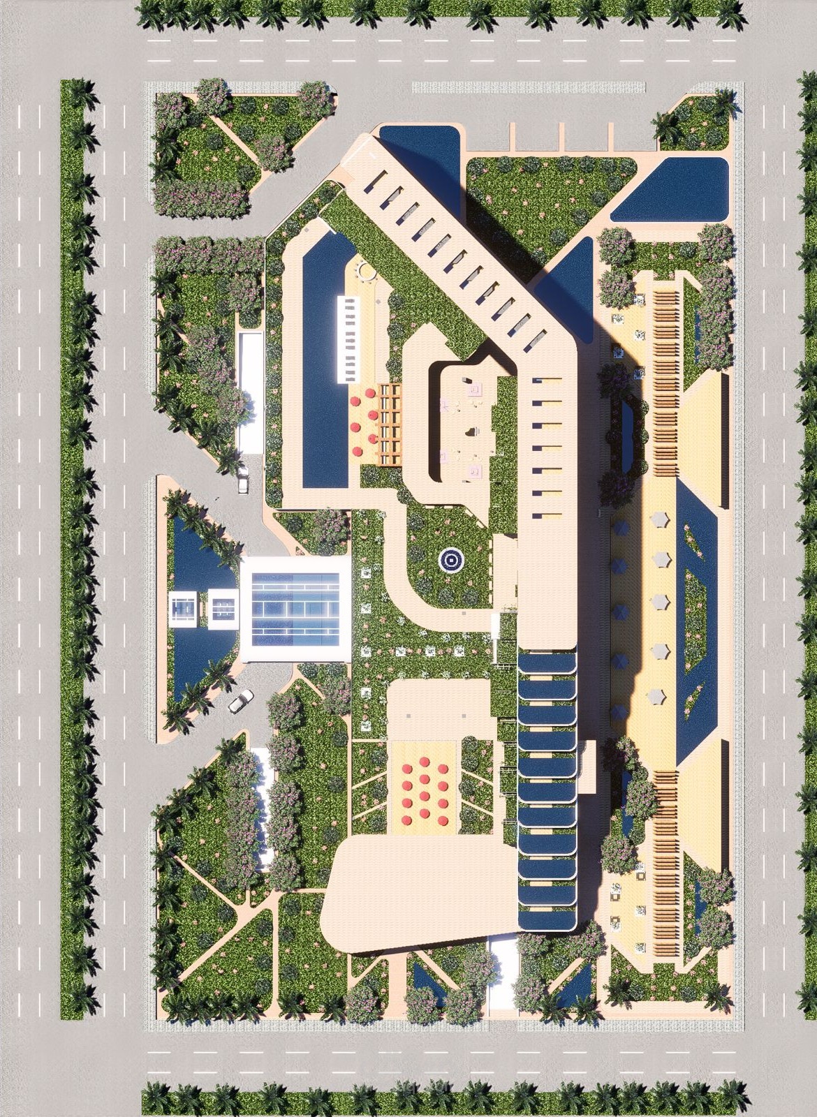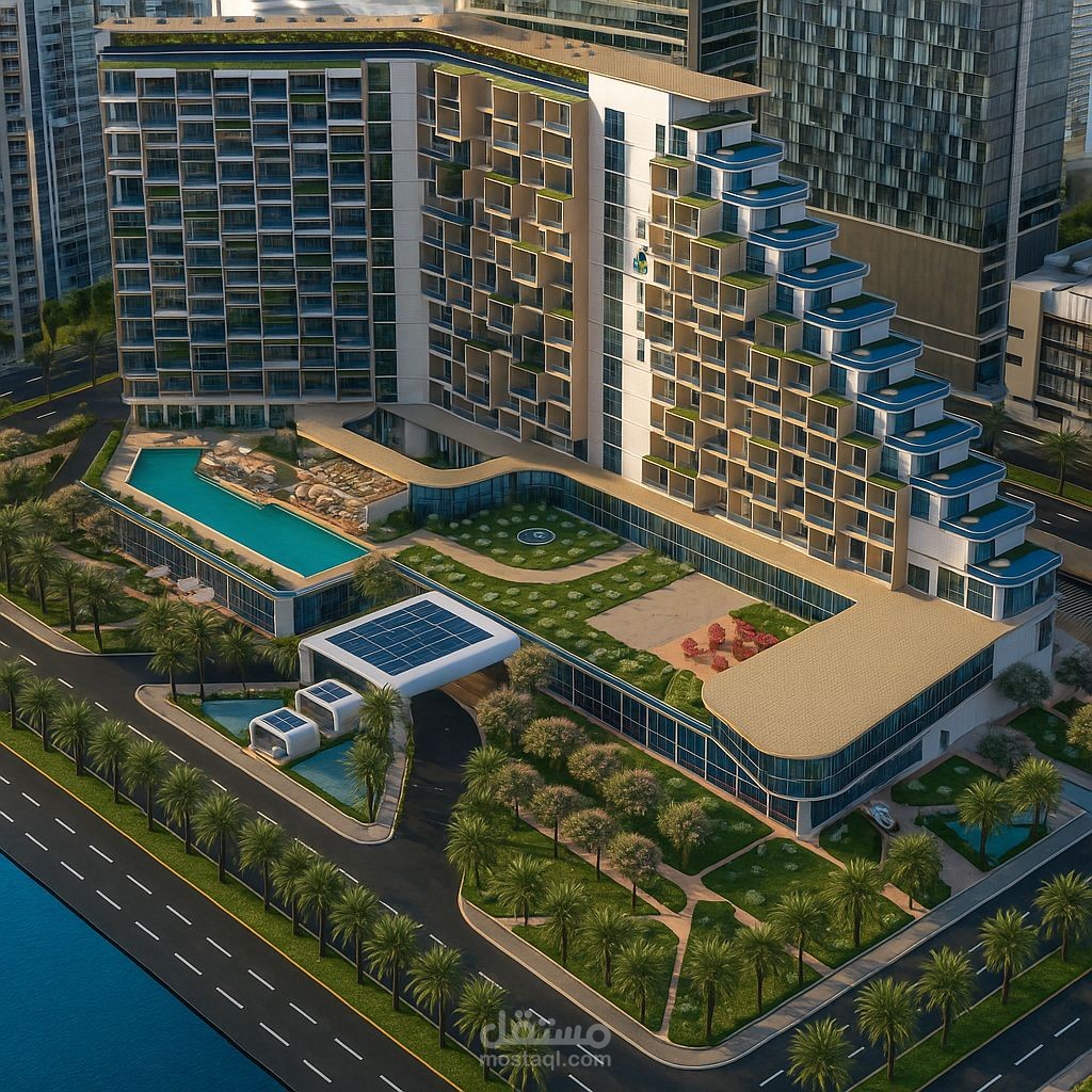 A hotel designed with sustainability and social interaction at its core. The building is terraced, creating shaded spaces underneath for people to sit and gather. Guest rooms are designed as projecting cubes, extending beyond the balconies to ensure privacy while offering unique views. The architecture balances eco-friendly, community spaces, and innovative forms to create a distinctive hospitality experience.